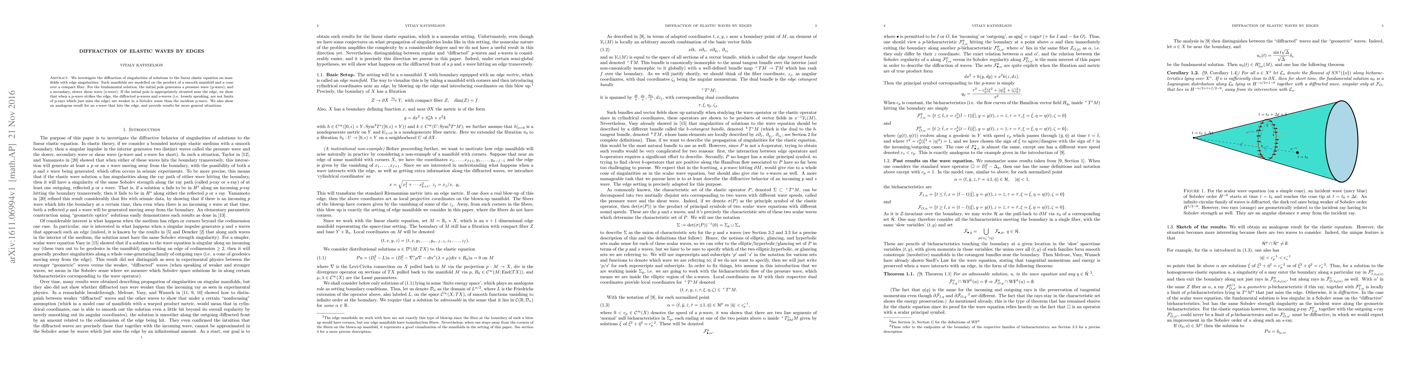 We investigate the diffraction of singularities of solutions to the linear elastic equation on manifolds with edge singularities. Such manifolds are modeled on the product of a smooth manifold and a cone over a compact fiber. For the fundamental solution, the initial pole generates a pressure wave (p-wave), and a secondary, slower shear wave (s wave). If the initial pole is appropriately situated near the edge, we show that when a p-wave strikes the edge, the diffracted p-waves and s-waves (i.e. loosely speaking, do not correspond to limits of p-rays which just miss the edge) are weaker in a Sobolev sense than the incident p-wave. We also show an analogous result for an s-wave that hits the edge, and provide results for more general situations.