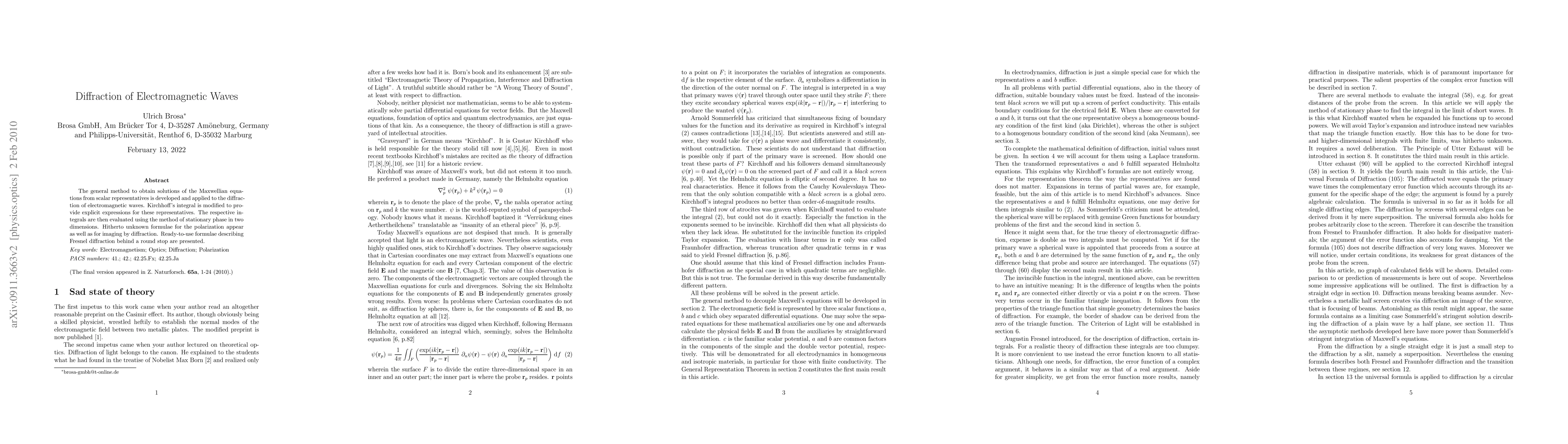 The general method to obtain solutions of the Maxwellian equations from scalar representatives is developed and applied to the diffraction of electromagnetic waves. Kirchhoff's integral is modified to provide explicit expressions for these representatives. The respective integrals are then evaluated using the method of stationary phase in two dimensions. Hitherto unknown formulae for the polarization appear as well as for imaging by diffraction. Ready-to-use formulae describing Fresnel diffraction behind a round stop are presented.