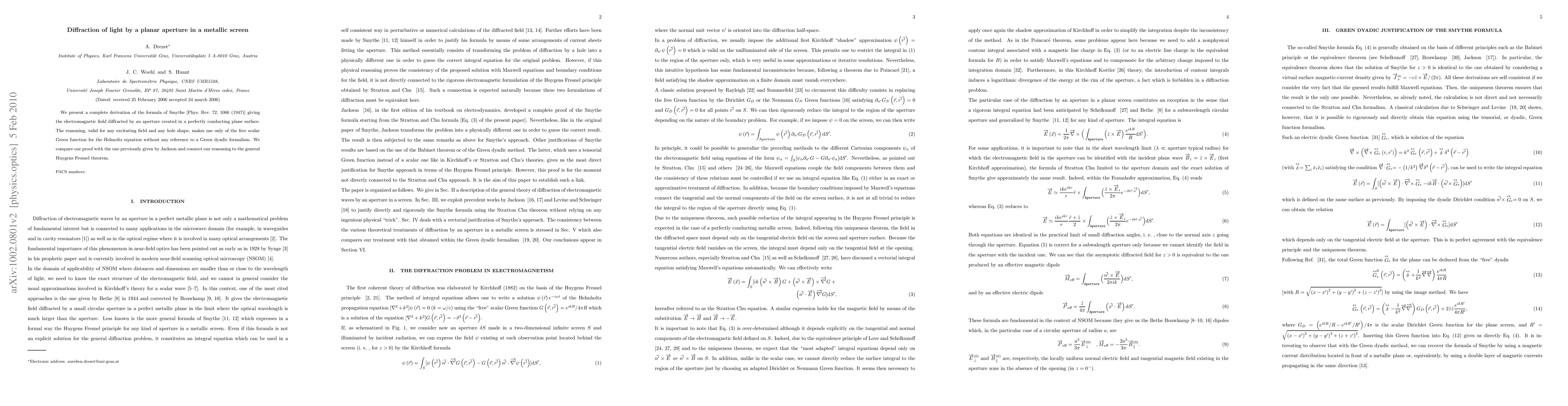 This paper derives Smythe's formula for electromagnetic diffraction through a planar aperture in a perfectly conducting metallic screen, using the free scalar Green function for the Helmholtz equation. The authors compare their derivation with Jackson's and relate it to the general Huygens-Fresnel principle.