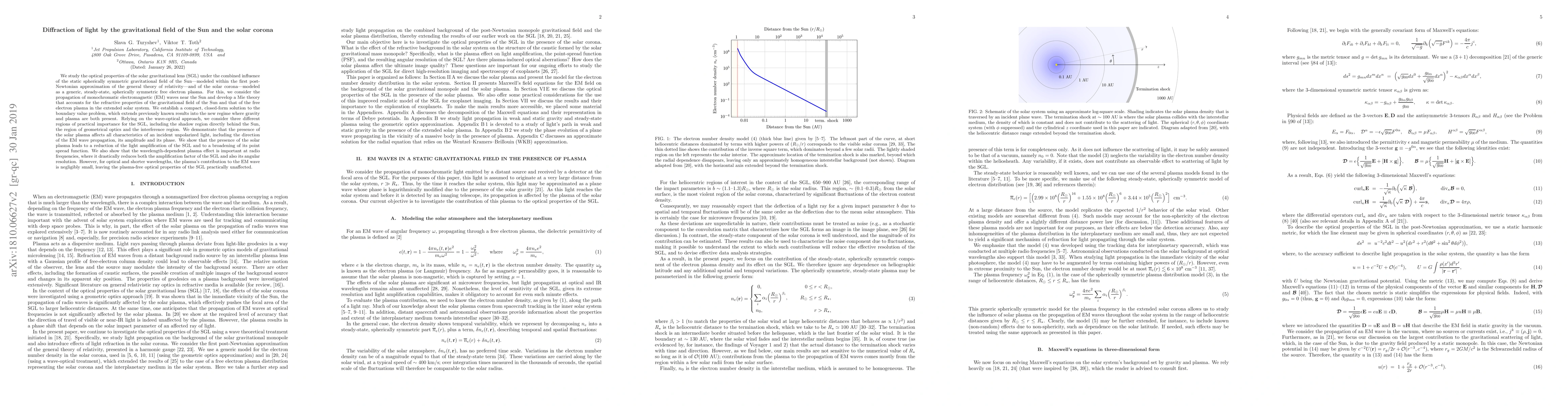 This paper develops a Mie theory to study the diffraction of light by the gravitational field of the Sun and the solar corona, showing that solar plasma reduces light amplification and broadens the point spread function of the solar gravitational lens, especially at radio frequencies. For optical wavelengths, the plasma's effect is negligible.