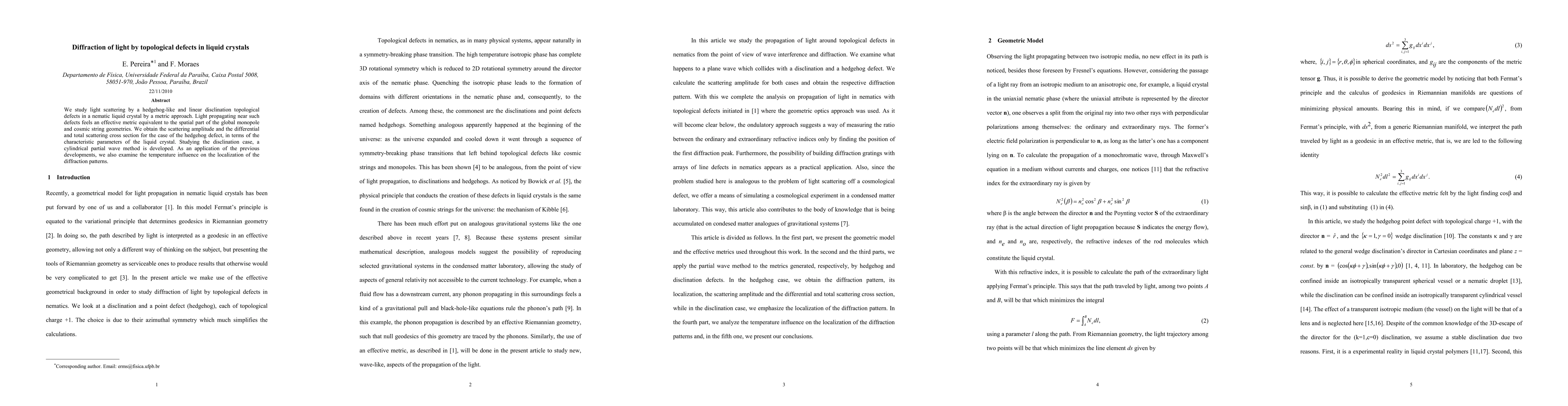 This paper investigates light scattering by topological defects in nematic liquid crystals, specifically hedgehog-like and linear disclination defects, using a metric approach. The study develops scattering amplitudes and cross sections for these defects, applying a cylindrical partial wave method for the disclination case, and examines the temperature effects on diffraction patterns.