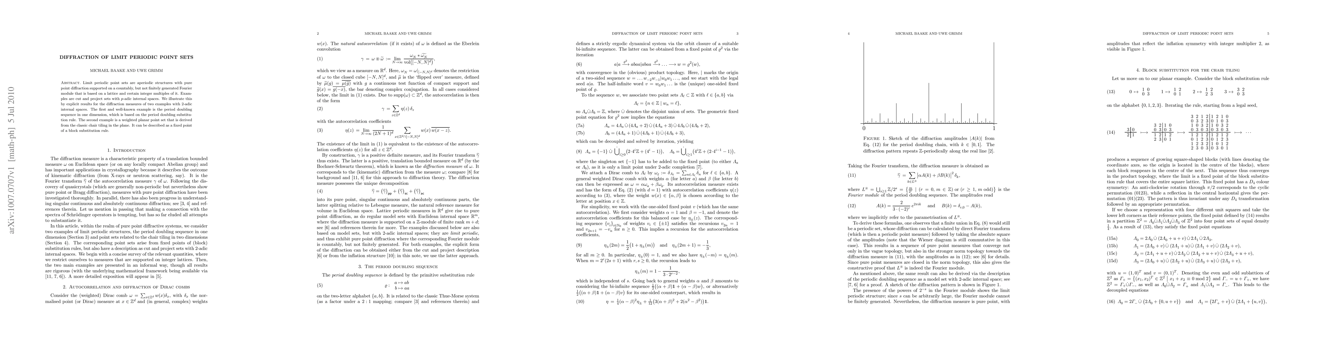 This paper explores limit periodic point sets, which exhibit pure point diffraction and are based on countably generated Fourier modules. It provides explicit results for the diffraction measures of two examples: the period doubling sequence and a weighted planar point set derived from the chair tiling, both with 2-adic internal spaces.