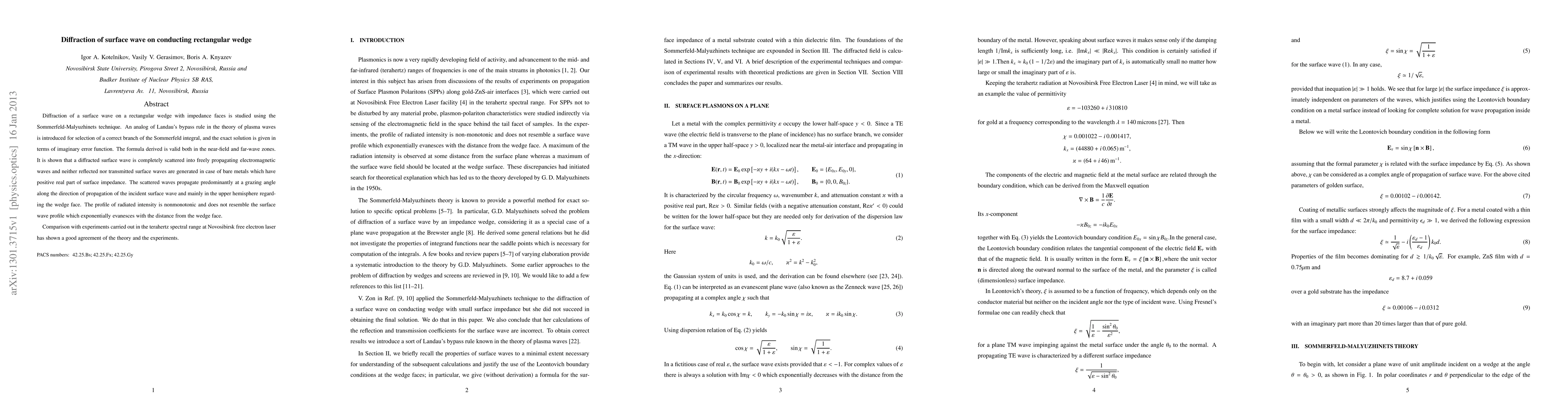 Diffraction of a surface wave on a rectangular wedge with impedance faces is studied using the Sommerfeld-Malyuzhinets technique. An analog of Landau's bypass rule in the theory of plasma waves is introduced for selection of a correct branch of the Sommerfeld integral, and the exact solution is given in terms of imaginary error function. The formula derived is valid both in the near-field and far-wave zones. It is shown that a diffracted surface wave is completely scattered into freely propagating electromagnetic waves and neither reflected nor transmitted surface waves are generated in case of bare metals which have positive real part of surface impedance. The scattered waves propagate predominantly at a grazing angle along the direction of propagation of the incident surface wave and mainly in the upper hemisphere regarding the wedge face. The profile of radiated intensity is nonmonotonic and does not resemble the surface wave profile which exponentially evanesces with the distance from the wedge face. Comparison with experiments carried out in the terahertz spectral range at Novosibirsk free electron laser has shown a good agreement of the theory and the experiments.