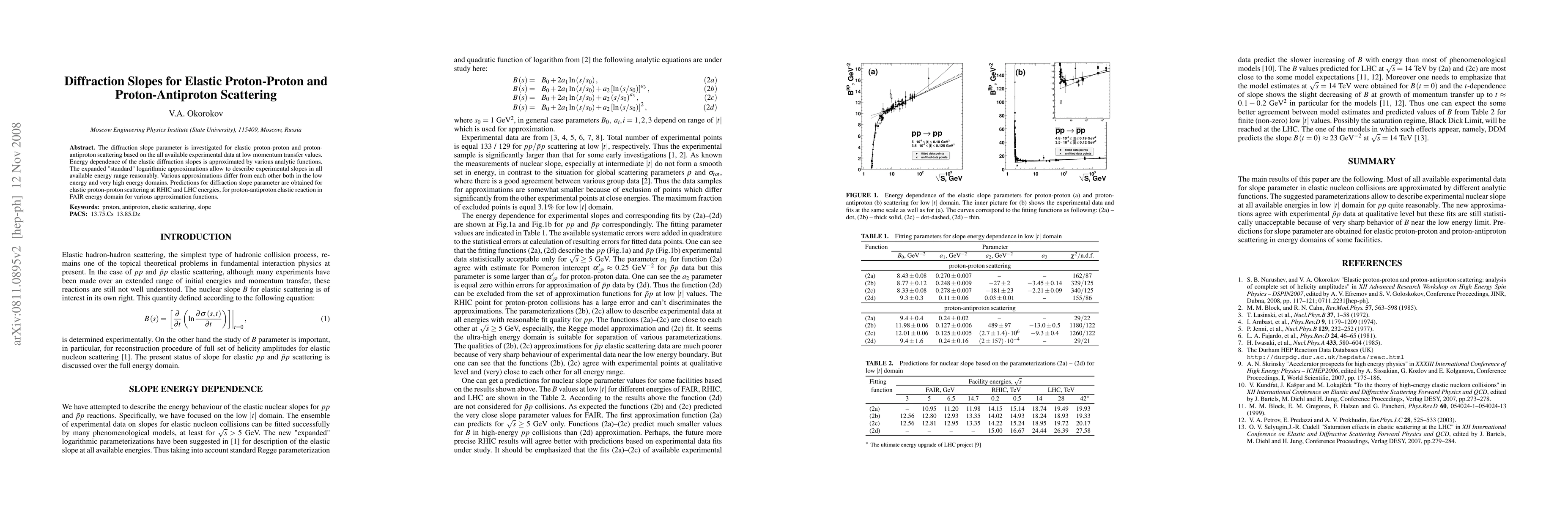 This paper investigates the diffraction slope parameter for elastic proton-proton and proton-antiproton scattering using available experimental data at low momentum transfer. Various analytic functions are used to approximate the energy dependence, with logarithmic approximations providing reasonable descriptions across the energy range.