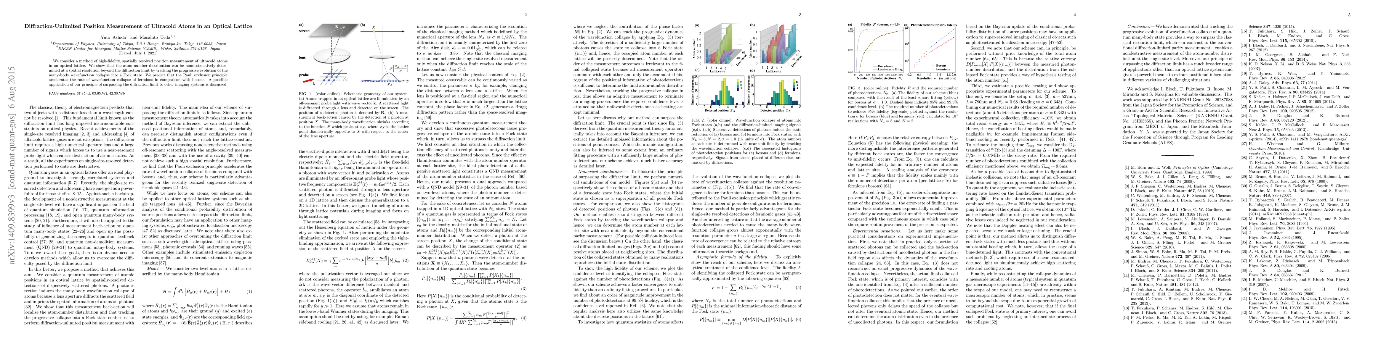 This paper proposes a high-fidelity method for nondestructively measuring the position of ultracold atoms in an optical lattice, surpassing the diffraction limit by tracking wavefunction collapse. It also predicts that the Pauli exclusion principle enhances the collapse rate for fermions compared to bosons.