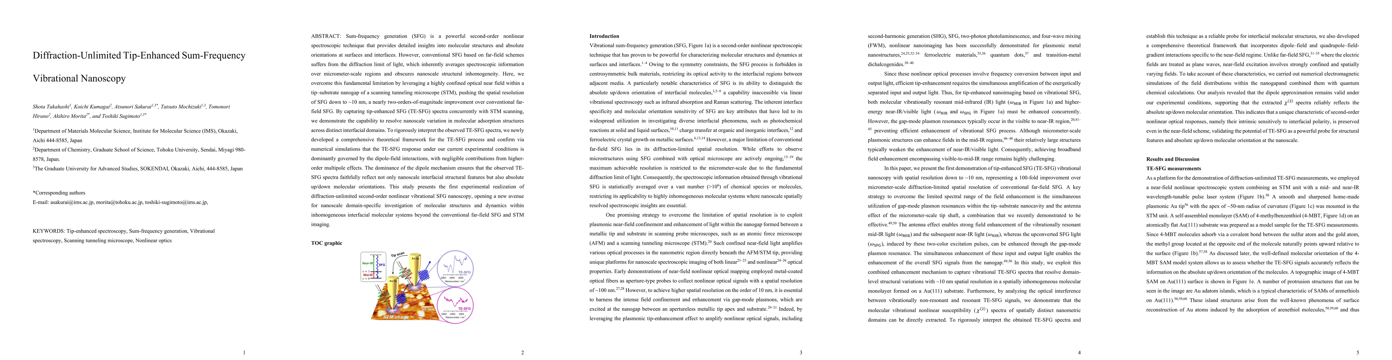 Sum-frequency generation (SFG) is a powerful second-order nonlinear spectroscopic technique that provides detailed insights into molecular structures and absolute orientations at surfaces and interfaces. However, conventional SFG based on far-field schemes suffers from the diffraction limit of light, which inherently averages spectroscopic information over micrometer-scale regions and obscures nanoscale structural inhomogeneity. Here, we overcome this fundamental limitation by leveraging a highly confined optical near field within a tip-substrate nanogap of a scanning tunneling microscope (STM), pushing the spatial resolution of SFG down to ~10 nm, a nearly two-orders-of-magnitude improvement over conventional far-field SFG. By capturing tip-enhanced SFG (TE-SFG) spectra concurrently with STM scanning, we demonstrate the capability to resolve nanoscale variation in molecular adsorption structures across distinct interfacial domains. To rigorously interpret the observed TE-SFG spectra, we newly developed a comprehensive theoretical framework for the TE-SFG process and confirm via numerical simulations that the TE-SFG response under our current experimental conditions is dominantly governed by the dipole-field interactions, with negligible contributions from higher-order multipole effects. The dominance of the dipole mechanism ensures that the observed TE-SFG spectra faithfully reflect not only nanoscale interfacial structural features but also absolute up/down molecular orientations. This study presents the first experimental realization of diffraction-unlimited second-order nonlinear vibrational SFG nanoscopy, opening a new avenue for nanoscale domain-specific investigation of molecular structures and dynamics within inhomogeneous interfacial molecular systems beyond the conventional far-field SFG and STM imaging.