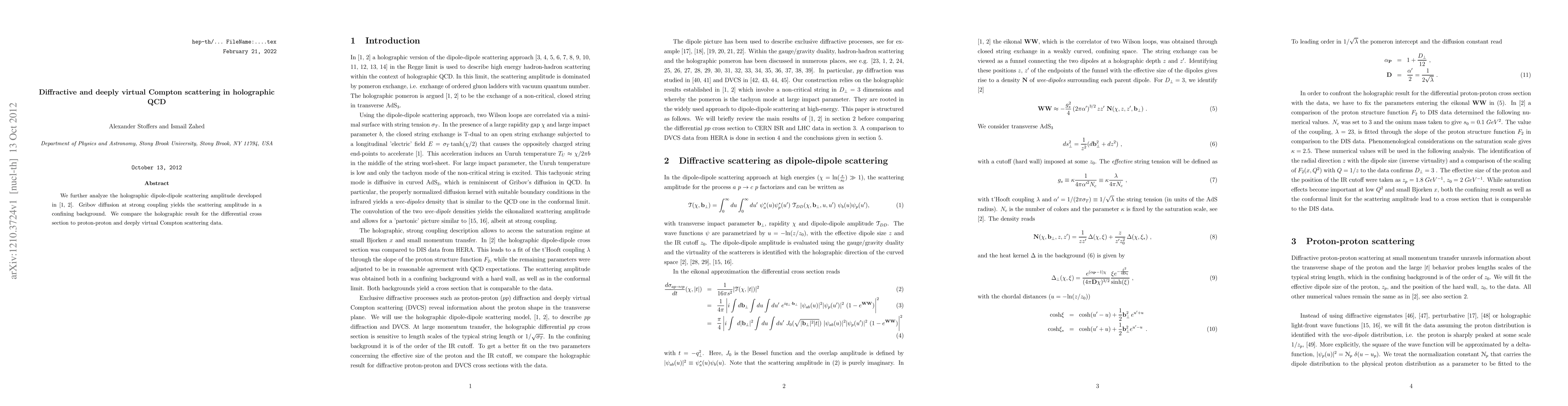 We further analyze the holographic dipole-dipole scattering amplitude developed in arXiv:1202.0831, 1205.3223. Gribov diffusion at strong coupling yields the scattering amplitude in a confining background. We compare the holographic result for the differential cross section to proton-proton and deeply virtual Compton scattering data.