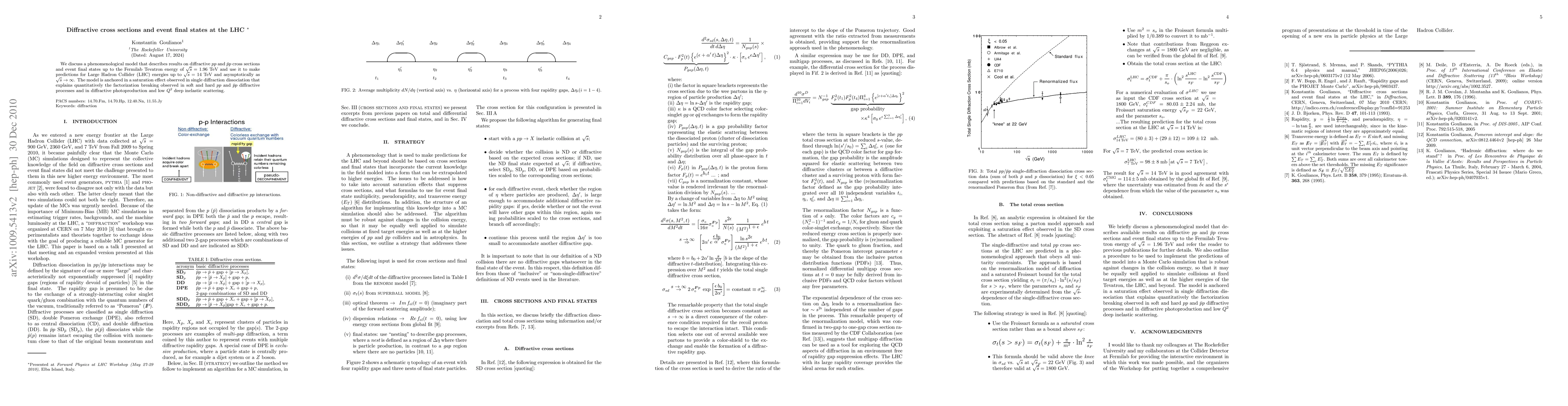 We discuss a phenomenological model that describes results on diffractive pp and pbar-p cross sections and event final states up to the Fermilab Tevatron collider energy of 1.96 TeV and use it to make predictions for Large Hadron Collider (LHC) collision energies up to 14 TeV and asymptotically as the pp collision energy goes to infinity. The model is anchored in a saturation effect observed in single diffraction dissociation that explains quantitatively the factorization breaking observed in soft and hard pp and pbar-p diffractive processes and in diffractive photoproduction and low Q-square deep inelastic scattering.