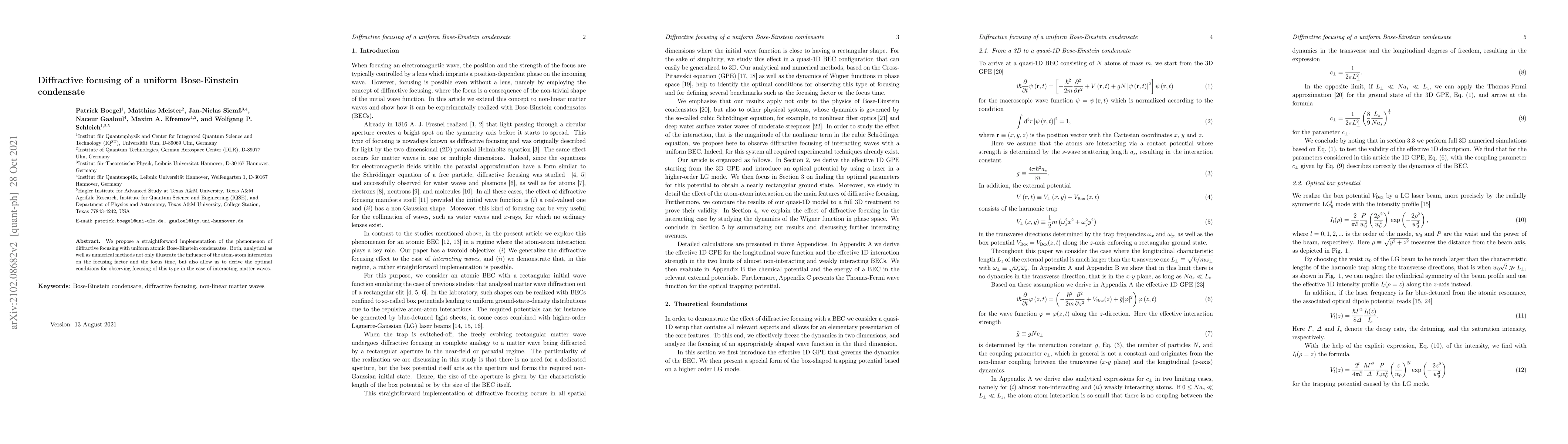 This research proposes a simple method to achieve diffractive focusing with uniform Bose-Einstein condensates, using both analytical and numerical techniques. It explores the impact of atom-atom interactions on focusing, determining optimal conditions for observing this phenomenon in interacting matter waves.