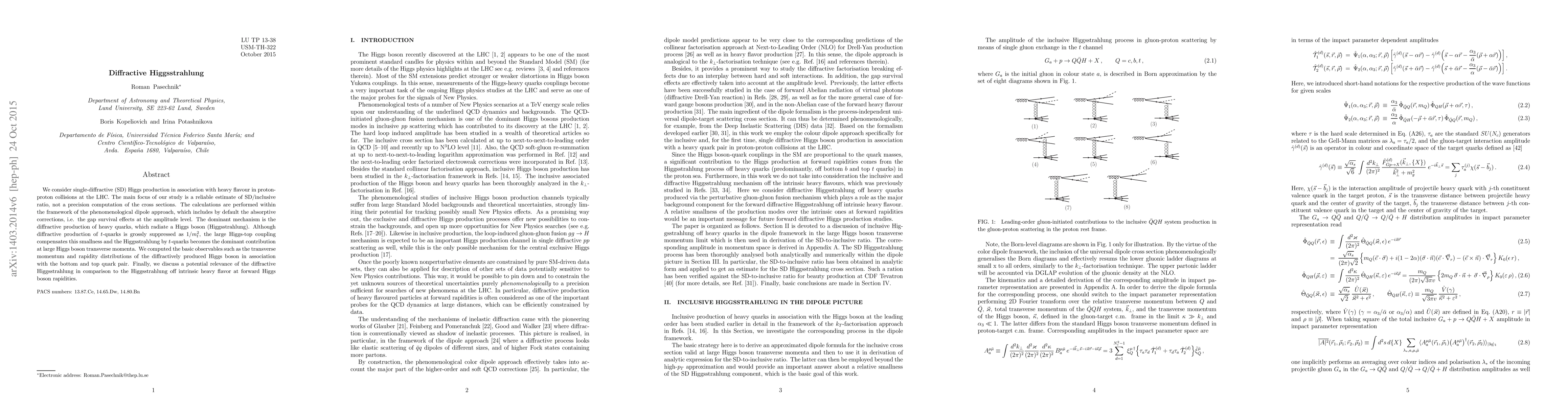 Researchers studied diffractive Higgs production in proton-proton collisions at the LHC, finding that it is dominated by Higgsstrahlung off top quarks due to their large coupling to the Higgs boson.