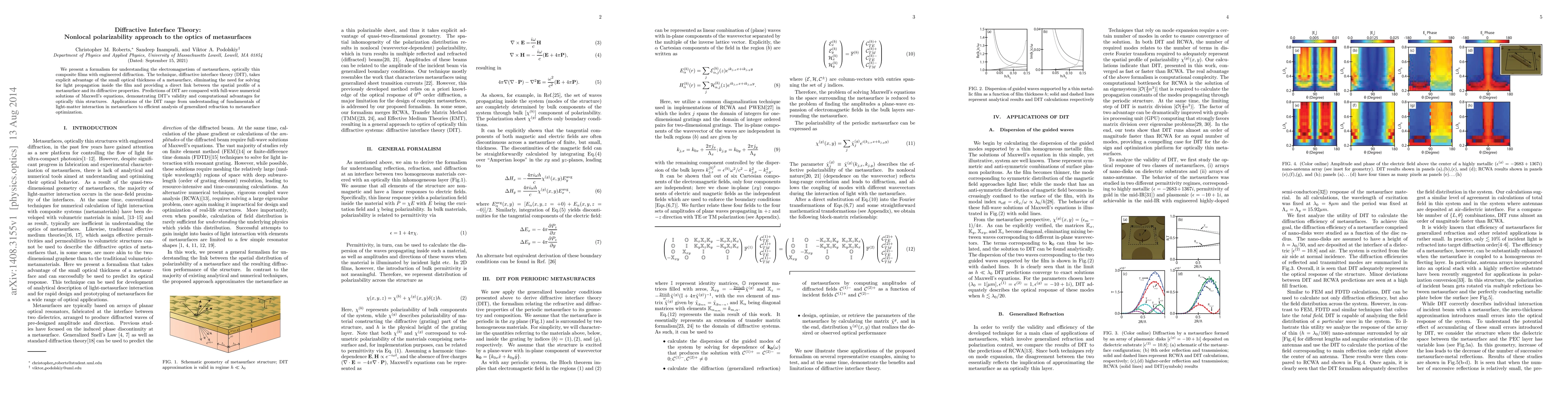 We present a formalism for understanding the elecromagnetism of metasurfaces, optically thin composite films with engineered diffraction. The technique, diffractive interface theory (DIT), takes explicit advantage of the small optical thickness of a metasurface, eliminating the need for solving for light propagation inside the film and providing a direct link between the spatial profile of a metasurface and its diffractive properties. Predictions of DIT are compared with full-wave numerical solutions of Maxwell's equations, demonstrating DIT's validity and computational advantages for optically thin structures. Applications of the DIT range from understanding of fundamentals of light-matter interaction in metasurfaces to efficient analysis of generalized refraction to metasurface optimization.