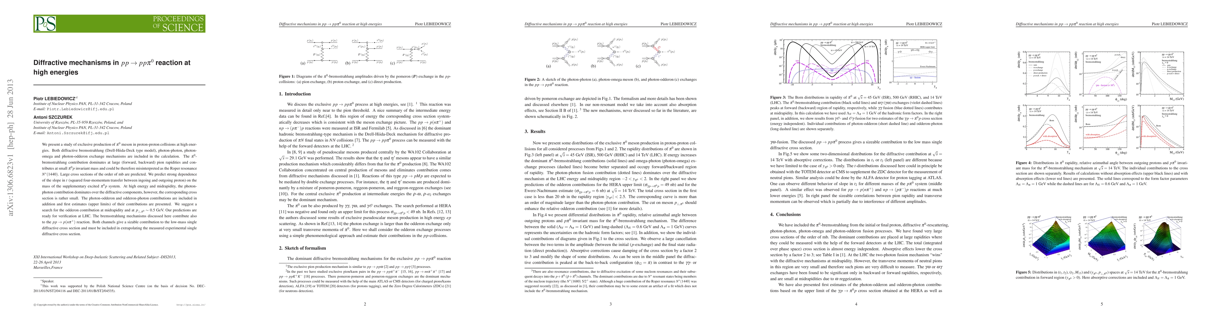 We present a study of exclusive production of $\pi^{0}$ meson in proton-proton collisions at high energies. Both diffractive bremsstrahlung (Drell-Hiida-Deck type model), photon-photon, photon-omega and photon-odderon exchange mechanisms are included in the calculation. The $\pi^{0}$-bremsstrahlung contribution dominates at large (forward, backward) pion rapidities and contributes at small $\pi^0 p$ invariant mass and could be therefore misinterpreted as the Roper resonance $N^{*}(1440)$. Large cross sections of the order of mb are predicted. We predict strong dependence of the slope in $t$ (squared four-momentum transfer between ingoing and outgoing proton) on the mass of the supplementary excited $\pi^{0} p$ system. At high energy and midrapidity, the photon-photon contribution dominates over the diffractive components, however, the corresponding cross section is rather small. The photon-odderon and odderon-photon contributions are included in addition and first estimates (upper limits) of their contributions are presented. We suggest a search for the odderon contribution at midrapidity and at $p_{\perp,\pi^{0}} \sim$ 0.5 GeV. Our predictions are ready for verification at LHC. The bremsstrahlung mechanisms discussed here contribute also to the $pp \to p(n \pi^{+})$ reaction. Both channels give a sizable contribution to the low-mass single diffractive cross section and must be included in extrapolating the measured experimental single diffractive cross section.