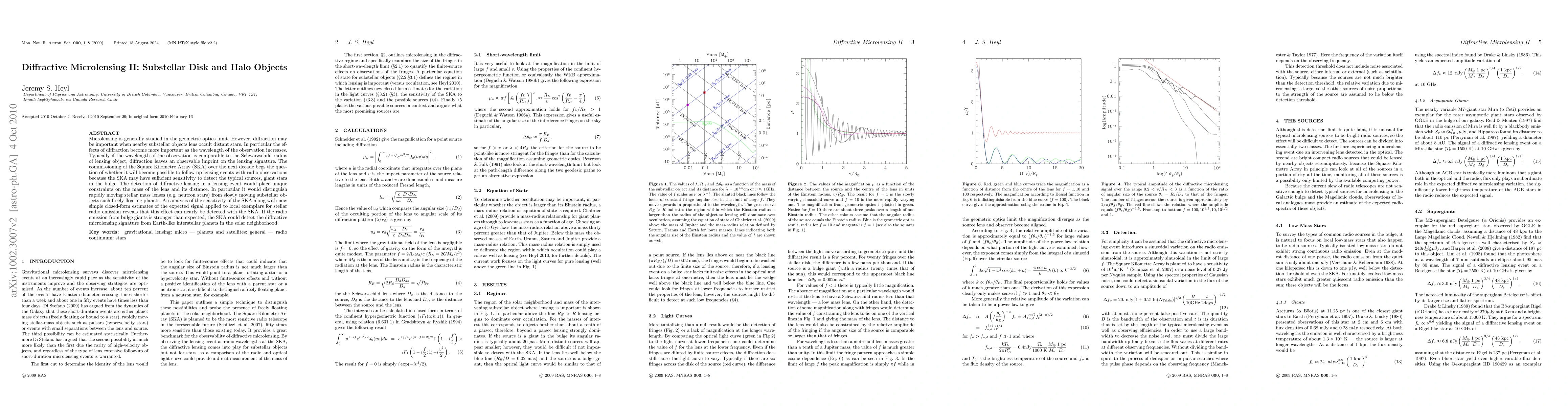 Microlensing is generally studied in the geometric optics limit. However, diffraction may be important when nearby substellar objects lens occult distant stars. In particular the effects of diffraction become more important as the wavelength of the observation increases. Typically if the wavelength of the observation is comparable to the Schwarzschild radius of lensing object, diffraction leaves an observable imprint on the lensing signature. The commissioning of the Square Kilometre Array (SKA) over the next decade begs the question of whether it will become possible to follow up lensing events with radio observations because the SKA may have sufficient sensitivity to detect the typical sources, giant stars in the bulge. The detection of diffractive lensing in a lensing event would place unique constraints on the mass of the lens and its distance. In particular it would distinguish rapidly moving stellar mass lenses (e.g. neutron stars) from slowly moving substellar objects such freely floating planets. An analysis of the sensitivity of the SKA along with new simple closed-form estimates of the expected signal applied to local exemplars for stellar radio emission reveals that this effect can nearly be detected with the SKA. If the radio emission from bulge giants is stronger than expected, the SKA could detect the diffractive microlensing signature from Earth-like interstellar planets in the solar neighborhood.