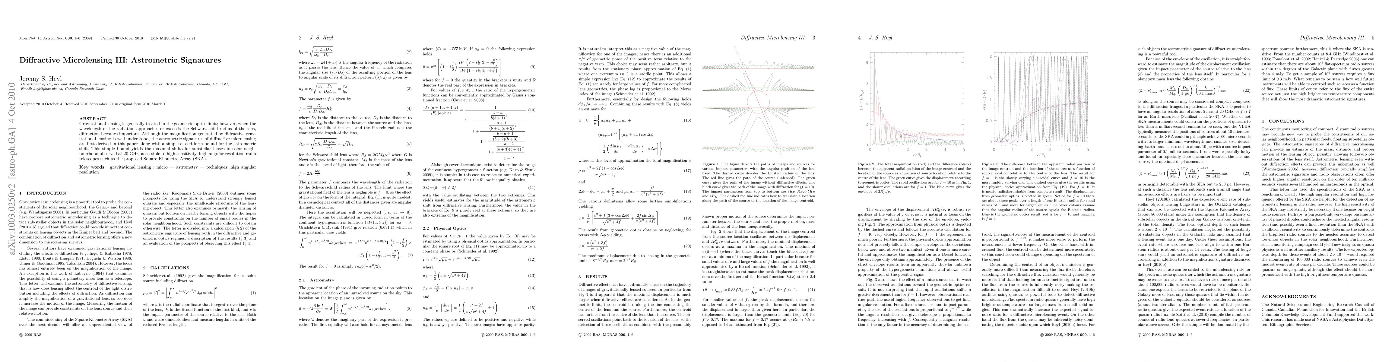 Gravitational lensing is generally treated in the geometric optics limit; however, when the wavelength of the radiation approaches or exceeds the Schwarzschild radius of the lens, diffraction becomes important. Although the magnification generated by diffractive gravitational lensing is well understood, the astrometric signatures of diffractive microlensing are first derived in this paper along with a simple closed-form bound for the astrometric shift. This simple bound yields the maximal shifts for substellar lenses in solar neighbourhood observed at 20~GHz, accessible to high sensitivity, high angular resolution radio telescopes such as the proposed Square Kilometre Array (SKA).