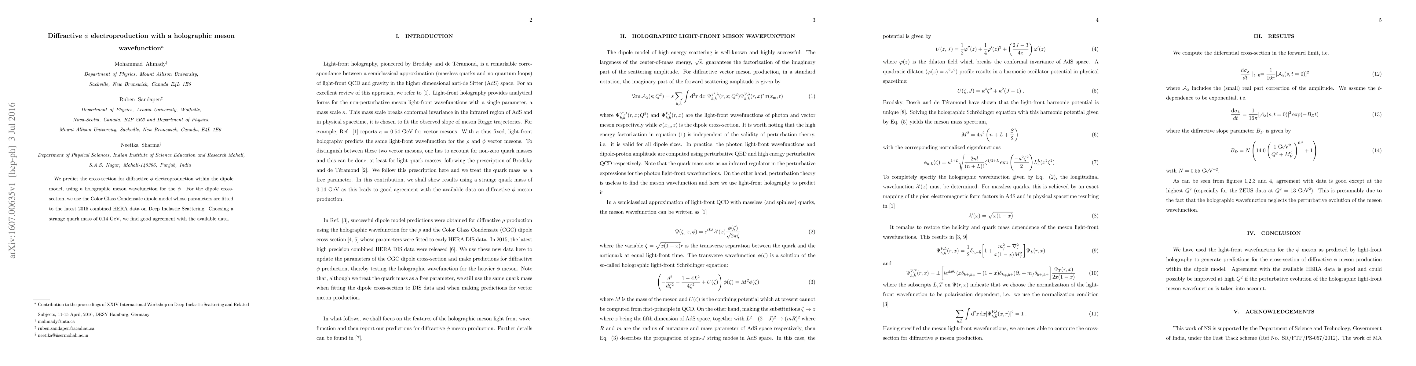 We predict the cross-section for diffractive $\phi$ electroproduction within the dipole model, using a holographic meson wavefunction for the $\phi$. For the dipole cross-section, we use the Color Glass Condensate dipole model whose parameters are fitted to the latest 2015 combined HERA data on Deep Inelastic Scattering. Choosing a strange quark mass of $0.14$ GeV, we find good agreement with the available data.