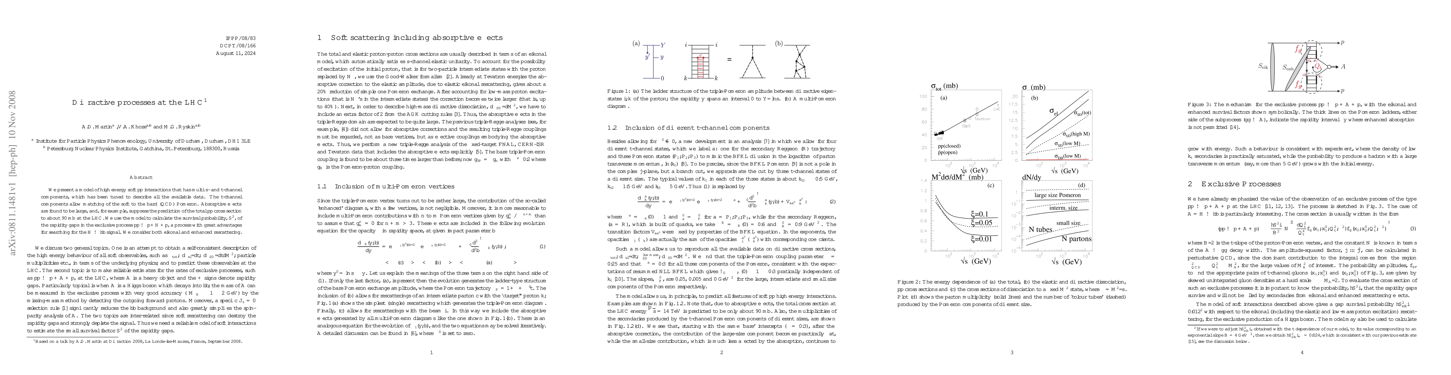 We present a model of high energy soft $pp$ interactions that has multi s- and t-channel components, which has been tuned to describe all the available data. The t-channel components allow matching of the soft to the hard (QCD) Pomeron. Absorptive effects are found to be large, and, for example, suppress the prediction of the total $pp$ cross section to about 90 mb at the LHC. We use the model to calculate the survival probability, S^2, of the rapidity gaps in the exclusive process pp \to p+H+p, a process with great advantages for searching for the H \to \bb signal. We consider both eikonal and enhanced rescattering.