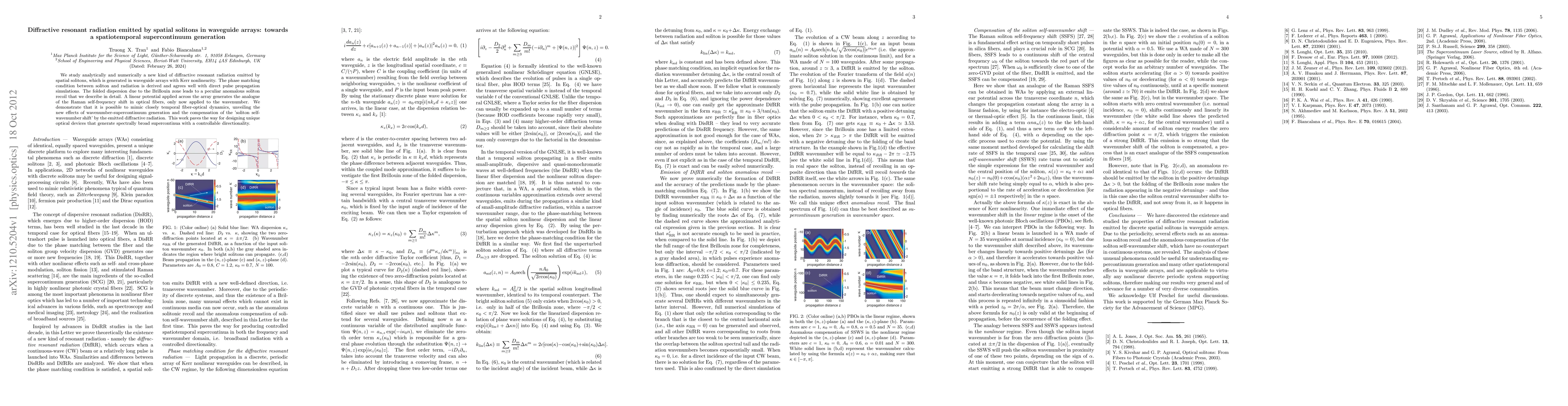 We study analytically and numerically a kind of diffractive resonant radiation emitted by spatial solitons, which is generated in waveguide arrays with Kerr nonlinearity. The phase matching condition between soliton and radiation is derived and agrees well with direct pulse propagation simulations. The folded dispersion due to the Brillouin zone leads to a peculiar anomalous soliton recoil that we describe in detail. A linear potential applied across the array generates the analogue of the Raman self-frequency shift in optical fibers, only now applied to the wavenumber. We demonstrate that it is possible to mimic closely temporal fiber-optical dynamics, unveiling the new effects of wavenumber-supercontinuum generation and the compensation of the 'soliton self-wavenumber shift' by the emitted diffractive radiation. This work paves the way for designing unique optical devices that generate spectrally broad supercontinua with a controllable directionality.