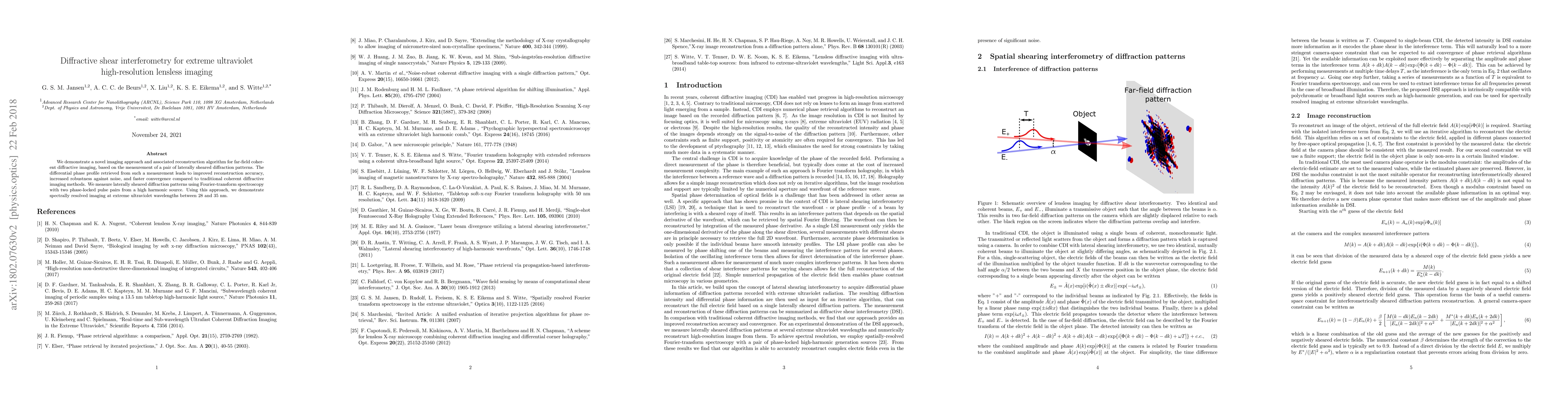 This paper introduces a novel diffractive shear interferometry technique for high-resolution lensless imaging in the extreme ultraviolet range, utilizing laterally sheared diffraction patterns to enhance reconstruction accuracy and robustness against noise. The method employs Fourier-transform spectroscopy with high harmonic sources for spectrally resolved imaging.