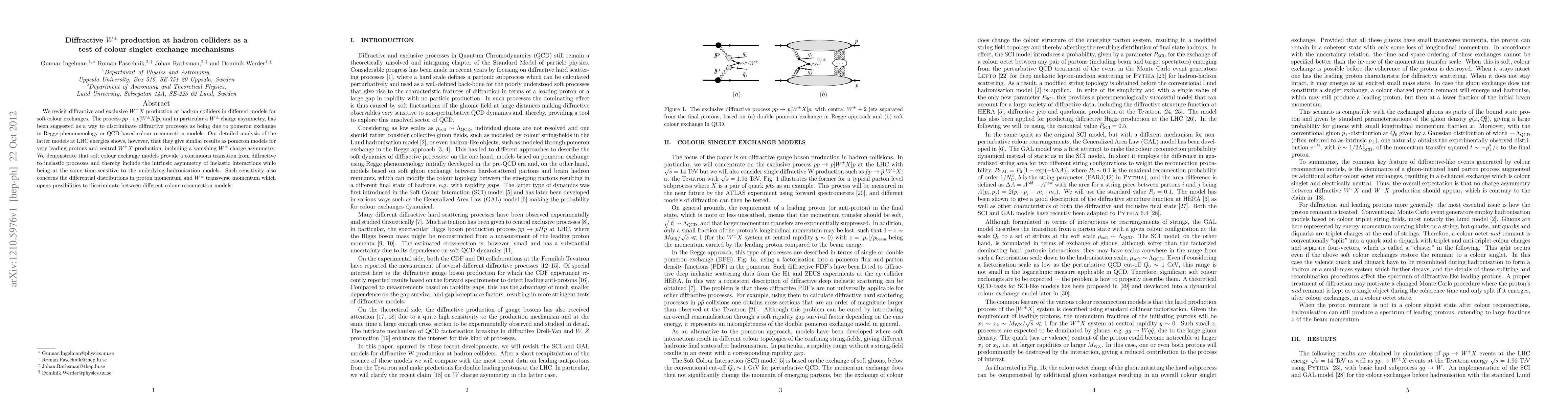 This paper examines diffractive W production at hadron colliders to test colour singlet exchange mechanisms, finding that QCD-based colour reconnection models yield similar results to pomeron models for leading protons and central W production, with a vanishing W charge asymmetry. It highlights the sensitivity of differential distributions in proton and W transverse momentum to distinguish between different colour reconnection models.