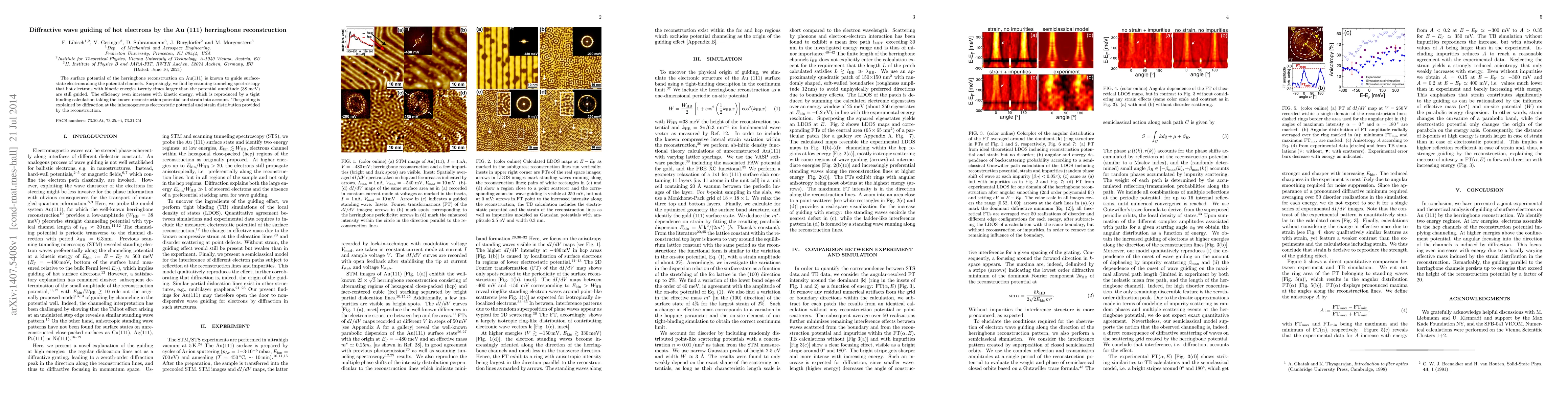 This study reveals that hot electrons with kinetic energies much greater than the surface potential amplitude of the Au(111) herringbone reconstruction are efficiently guided along the potential channels, a phenomenon explained by diffractive wave guiding due to the reconstruction's inhomogeneous electrostatic potential and strain. The efficiency of this guiding increases with higher kinetic energy, as shown by scanning tunneling spectroscopy and tight binding calculations.