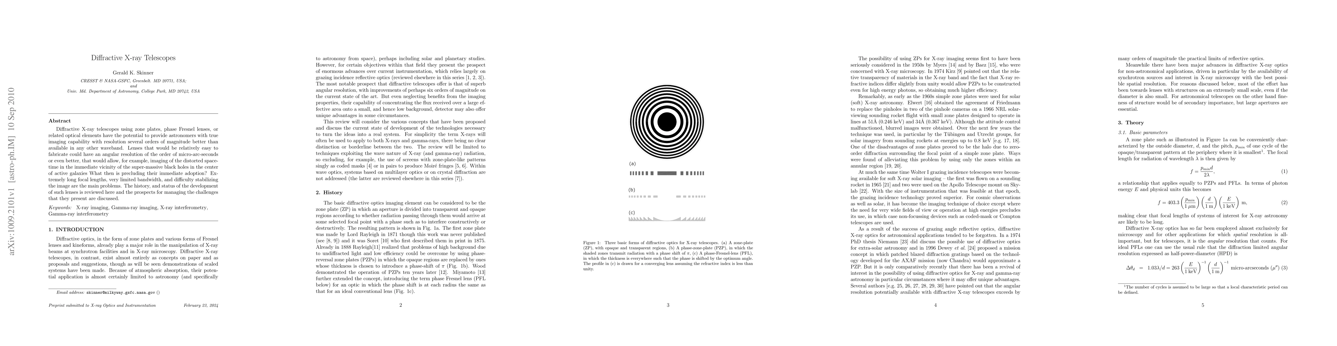 Diffractive X-ray telescopes using zone plates or phase Fresnel lenses offer improved resolution for astronomical imaging, but technical challenges such as long focal lengths and image stabilization hinder their adoption.