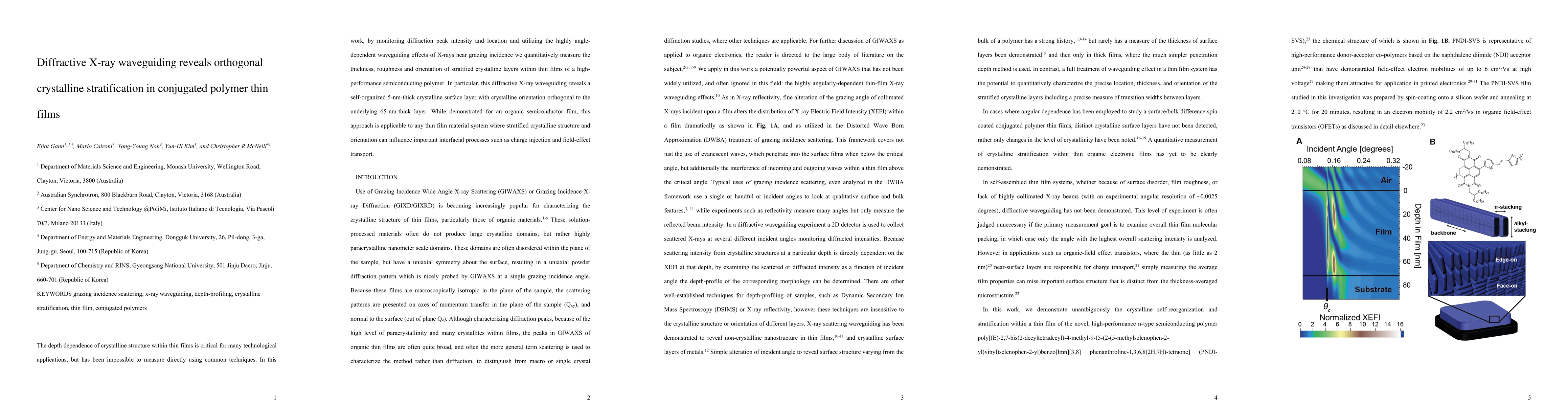 This study uses diffractive X-ray waveguiding to measure the depth-dependent crystalline structure in conjugated polymer thin films, revealing a 5-nm-thick surface layer with an orthogonal crystalline orientation compared to a 65-nm-thick underlying layer. This method provides insights into stratified crystalline structures that influence charge transport and other interfacial processes.