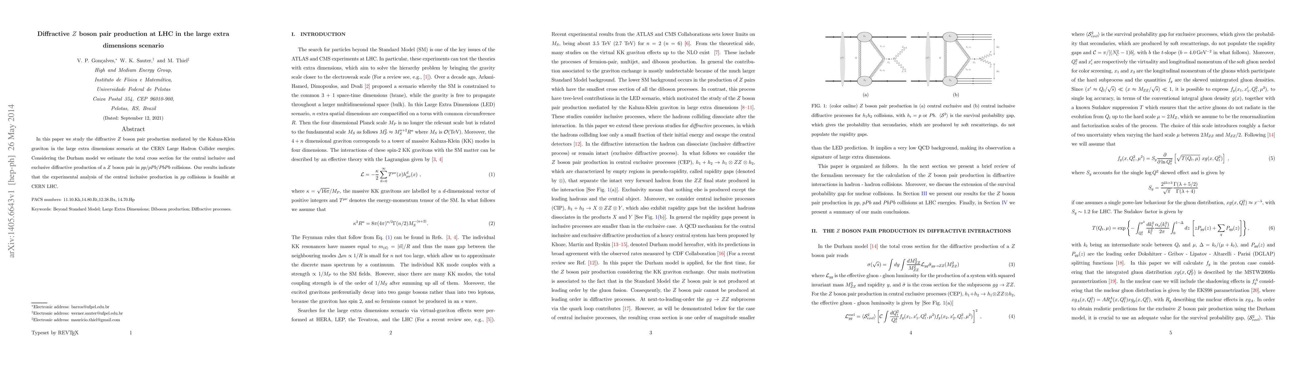 This paper investigates diffractive $Z$ boson pair production at the LHC, mediated by the Kaluza-Klein graviton in large extra dimensions. Using the Durham model, it estimates the total cross section for central inclusive and exclusive diffractive production in $pp/pPb/PbPb$ collisions, finding that central inclusive production in $pp$ collisions is feasible for experimental analysis at CERN LHC.