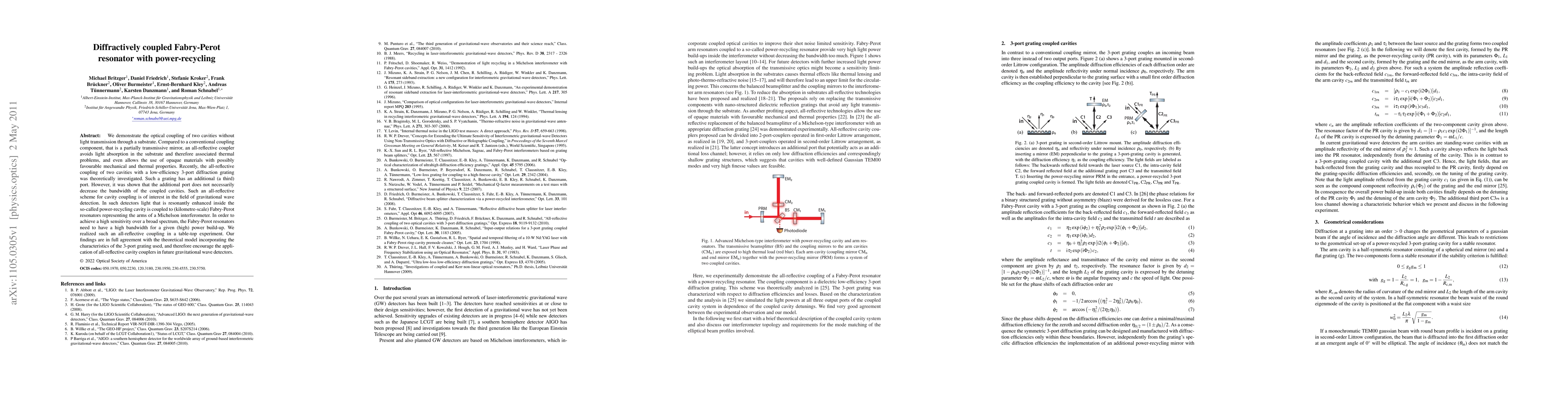 This paper demonstrates an all-reflective coupling method for two optical cavities using a diffraction grating, avoiding substrate absorption and thermal issues. The method maintains cavity bandwidth and is proposed for enhancing the sensitivity of gravitational wave detectors through power-recycling in Fabry-Perot resonators.