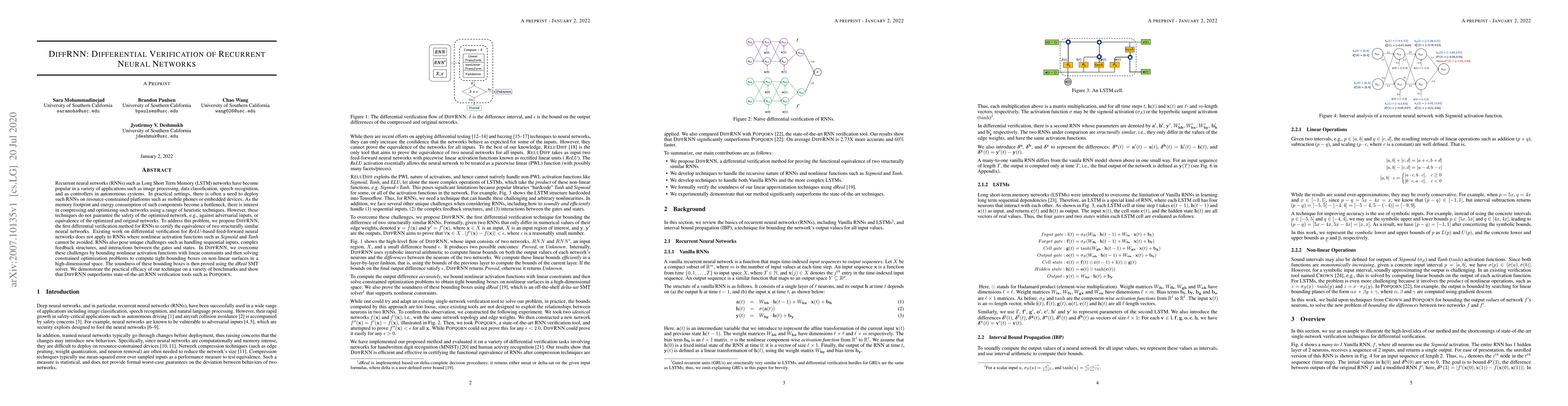 DiffRNN introduces a novel differential verification method to certify the equivalence of optimized and original Recurrent Neural Networks (RNNs), addressing safety concerns in resource-constrained deployments. It overcomes unique RNN challenges by bounding nonlinear activation functions and proving soundness with the dReal SMT solver, outperforming existing verification tools.