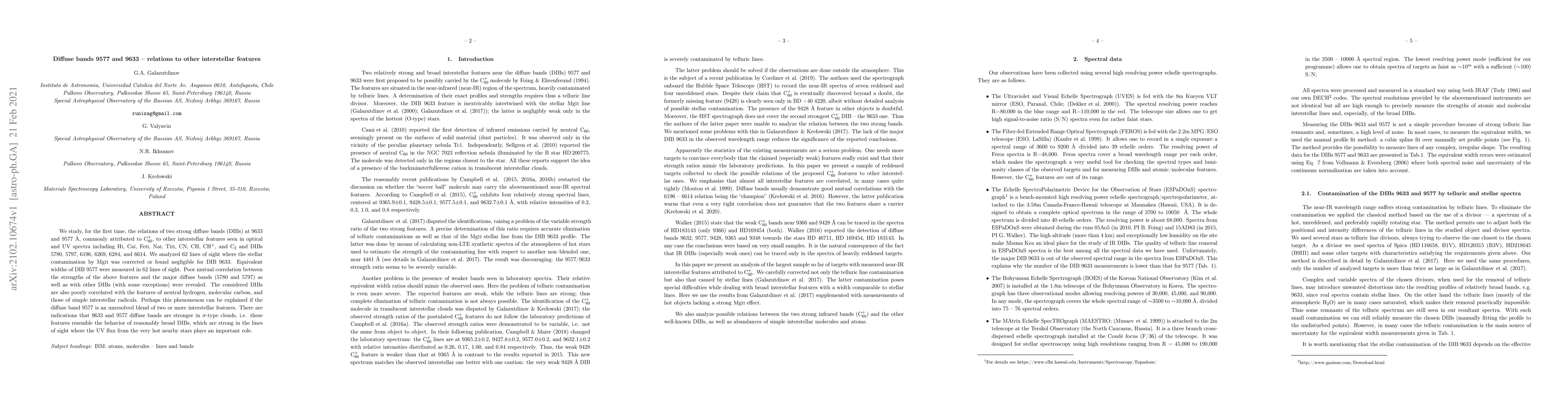 Researchers studied strong diffuse bands 9577 and 9633 in interstellar space, finding they don't correlate with other features, but may be blends of multiple features, and are stronger in certain cloud types.