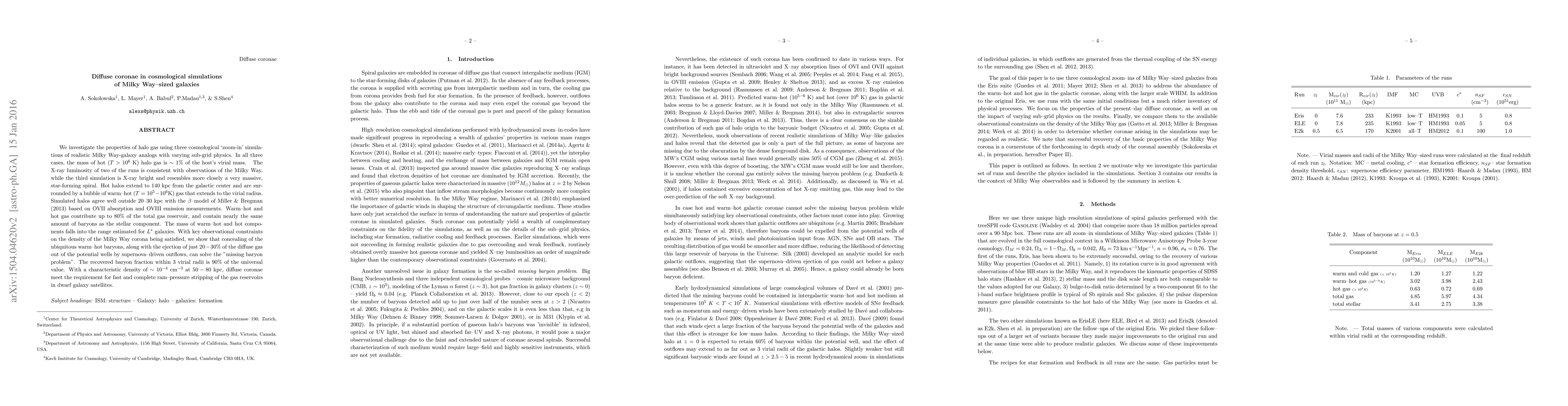 We investigate the properties of halo gas using three cosmological `zoom-in' simulations of realistic Milky Way-galaxy analogs with varying sub-grid physics. In all three cases, the mass of hot ($T > 10^6$ K) halo gas is $\sim 1\%$ of the host's virial mass. The X-ray luminosity of two of the runs is consistent with observations of the Milky Way, while the third simulation is X-ray bright and resembles more closely a very massive, star-forming spiral. Hot halos extend to 140 kpc from the galactic center and are surrounded by a bubble of warm-hot ($T = 10^5 - 10^6$K) gas that extends to the virial radius. Simulated halos agree well outside 20-30 kpc with the $\beta$-model of Miller & Bregman (2013) based on OVII absorption and OVIII emission measurements. Warm--hot and hot gas contribute up to $80\%$ of the total gas reservoir, and contain nearly the same amount of baryons as the stellar component. The mass of warm-hot and hot components falls into the range estimated for $L^*$ galaxies. With key observational constraints on the density of the Milky Way corona being satisfied, we show that concealing of the ubiquitous warm-hot baryons, along with the ejection of just $20-30 \%$ of the diffuse gas out of the potential wells by supernova-driven outflows, can solve the "missing baryon problem". The recovered baryon fraction within 3 virial radii is $90\%$ of the universal value. With a characteristic density of $\sim 10^{-4}$ cm$^{-3}$ at $50-80$ kpc, diffuse coronae meet the requirement for fast and complete ram--pressure stripping of the gas reservoirs in dwarf galaxy satellites.