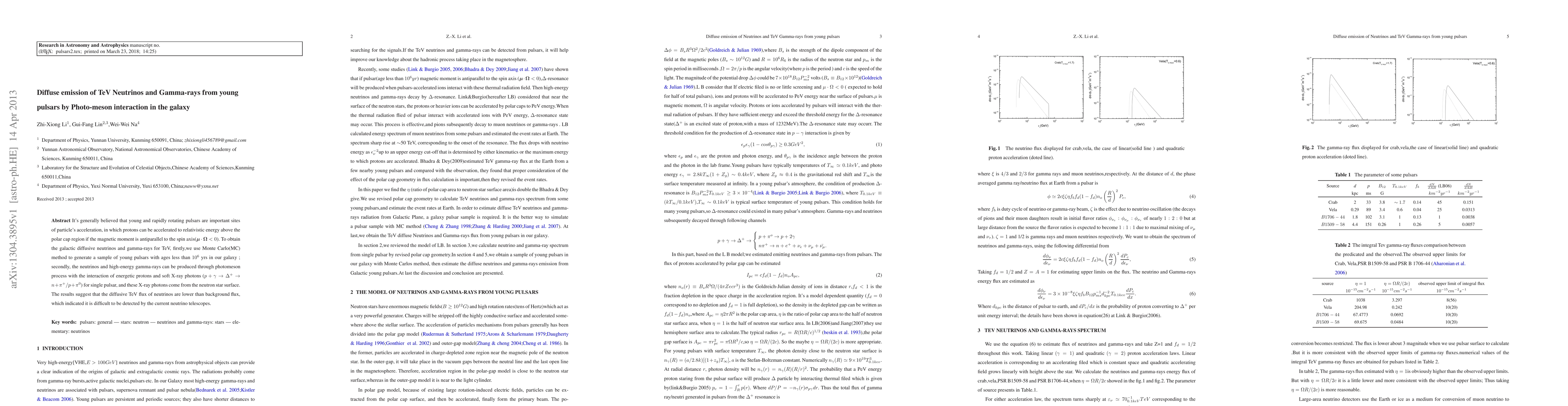 It's generally believed that young and rapidly rotating pulsars are important sites of particle's acceleration, in which protons can be accelerated to relativistic energy above the polar cap region if the magnetic moment is antiparallel to the spin axis($\vec{\mu}\cdot\vec{\Omega}<0$). To obtain the galactic diffusive neutrinos and gamma-rays for TeV, firstly,we use Monte Carlo(MC) method to generate a sample of young pulsars with ages less than $10^6$ yrs in our galaxy ; secondly, the neutrinos and high-energy gamma-rays can be produced through photomeson process with the interaction of energetic protons and soft X-ray photons ($p+\gamma\rightarrow \Delta^+\rightarrow n+\pi^+/p+\pi^0$) for single pulsar, and these X-ray photons come from the neutron star surface. The results suggest that the diffusive TeV flux of neutrinos are lower than background flux, which indicated it is difficult to be detected by the current neutrino telescopes.