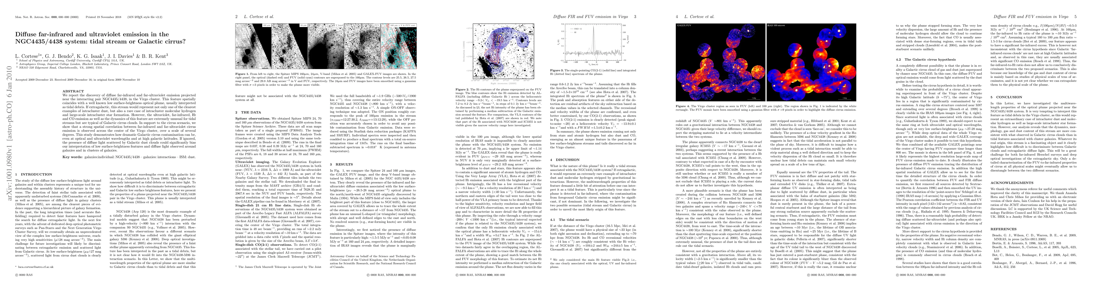 This study identifies unusual diffuse far-infrared and ultraviolet emission near the NGC4435/4438 galaxy pair, initially thought to be tidal debris, but finds characteristics more consistent with Galactic cirrus clouds, highlighting the potential for significant contamination from our own galaxy's dust.