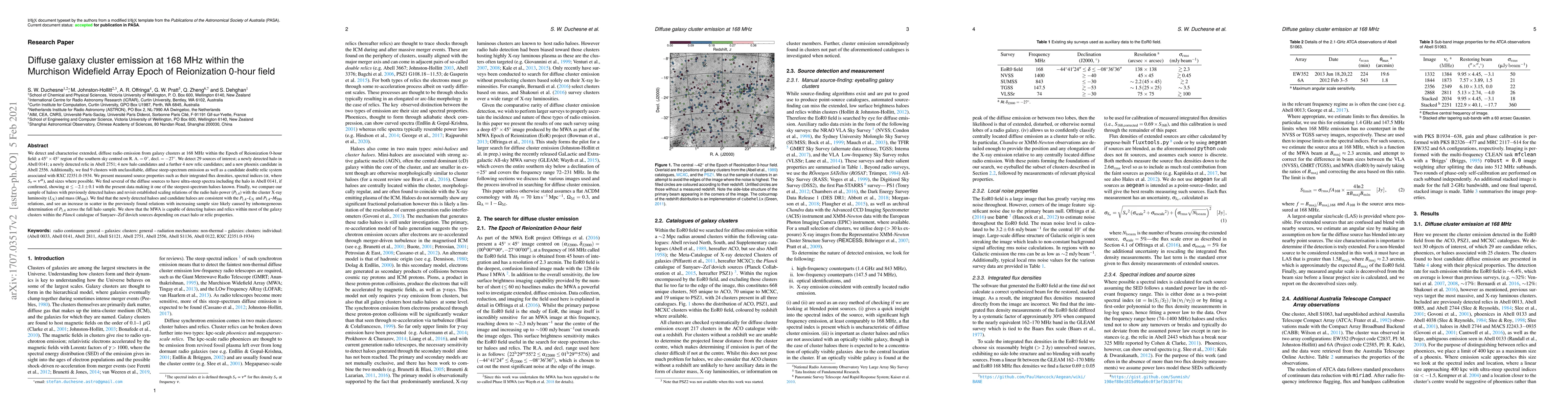 We detect and characterise extended, diffuse radio emission from galaxy clusters at 168 MHz within the Epoch of Reionization 0-hour field: a $45^\circ \times 45^\circ$ region of the southern sky centred on R.~A.${}= 0^\circ$, decl.${}=-27^\circ$. We detect 29 sources of interest; a newly detected halo in Abell 0141; a newly detected relic in Abell 2751; 4 new halo candidates and a further 4 new relic candidates; and a new phoenix candidate in Abell 2556. Additionally, we find 9 clusters with unclassifiable, diffuse steep-spectrum emission as well as a candidate double relic system associated with RXC J2351.0-1934. We present measured source properties such as their integrated flux densities, spectral indices ($\alpha$, where $S_\nu \propto \nu^\alpha$), and sizes where possible. We find several of the diffuse sources to have ultra-steep spectra including the halo in Abell 0141, if confirmed, showing $\alpha \leq -2.1 \pm 0.1$ with the present data making it one of the steepest-spectrum haloes known. Finally, we compare our sample of haloes with previously detected haloes and revisit established scaling relations of the radio halo power ($P_{1.4}$) with the cluster X-ray luminosity ($L_{\mathrm{X}}$) and mass ($M_{500}$). We find that the newly detected haloes and candidate haloes are consistent with the $P_{1.4}$-$L_{\mathrm{X}}$ and $P_{1.4}$-$M_{500}$ relations, and see an increase in scatter in the previously found relations with increasing sample size likely caused by inhomogeneous determination of $P_{1.4}$ across the full halo sample. We show that the MWA is capable of detecting haloes and relics within most of the galaxy clusters within the Planck catalogue of Sunyaev-Zel'dovich sources depending on exact halo or relic properties.