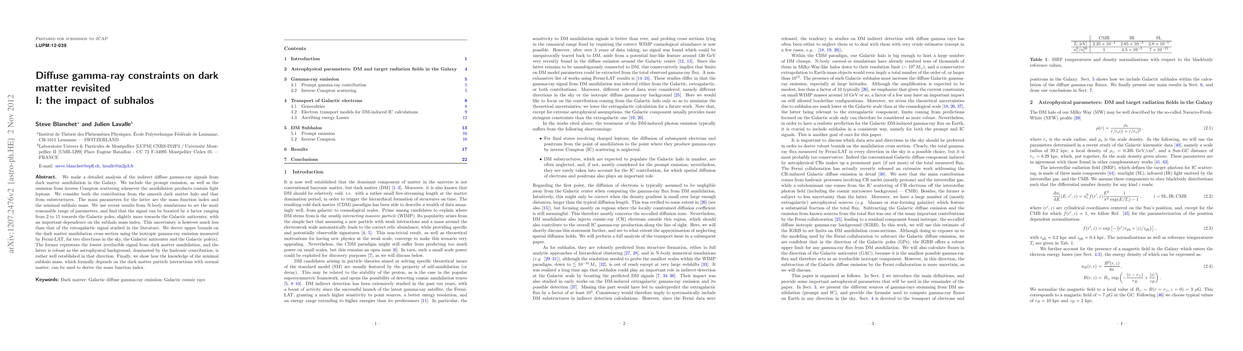 We make a detailed analysis of the indirect diffuse gamma-ray signals from dark matter annihilation in the Galaxy. We include the prompt emission, as well as the emission from inverse Compton scattering whenever the annihilation products contain light leptons. We consider both the contribution from the smooth dark matter halo and that from substructures. The main parameters for the latter are the mass function index and the minimal subhalo mass. We use recent results from N-body simulations to set the most reasonable range of parameters, and find that the signal can be boosted by a factor ranging from 2 to 15 towards the Galactic poles, slightly more towards the Galactic anticenter, with an important dependence on the subhalo mass index. This uncertainty is however much less than that of the extragalactic signal studied in the literature. We derive upper bounds on the dark matter annihilation cross section using the isotropic gamma-ray emission measured by Fermi-LAT, for two directions in the sky, the Galactic anticenter and the Galactic pole(s). The former represents the lowest irreducible signal from dark matter annihilation, and the latter is robust as the astrophysical background, dominated by the hadronic contribution, is rather well established in that direction. Finally, we show how the knowledge of the minimal subhalo mass, which formally depends on the dark matter particle interactions with normal matter, can be used to derive the mass function index.