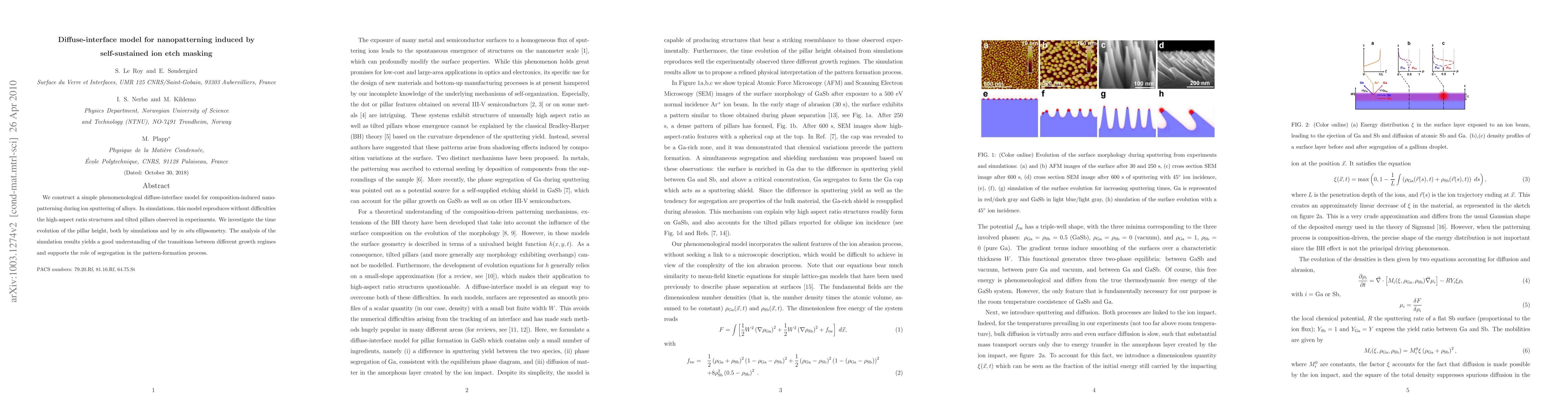 We construct a simple phenomenological diffuse-interface model for composition-induced nanopatterning during ion sputtering of alloys. In simulations, this model reproduces without difficulties the high-aspect ratio structures and tilted pillars observed in experiments. We investigate the time evolution of the pillar height, both by simulations and by {\it in situ} ellipsometry. The analysis of the simulation results yields a good understanding of the transitions between different growth regimes and supports the role of segregation in the pattern-formation process.