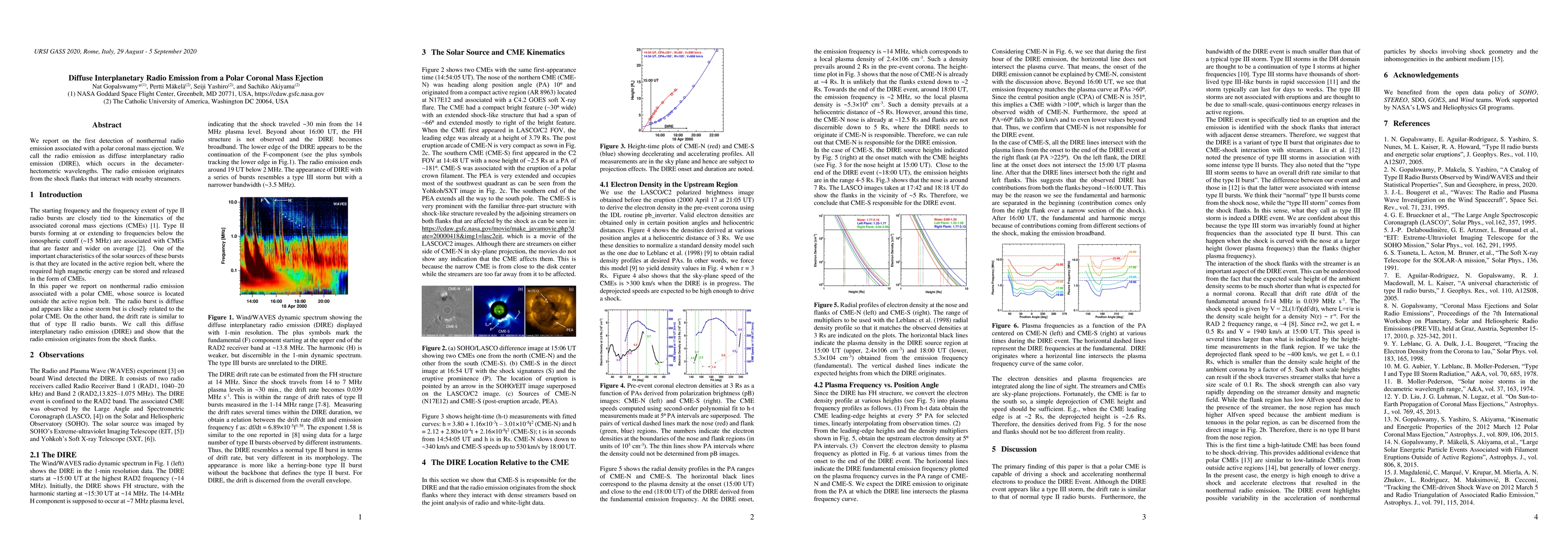 Summary: This study reports the first detection of diffuse interplanetary radio emission (DIRE) linked to a polar coronal mass ejection, occurring in decameter-hectometric wavelengths and originating from shock flanks interacting with nearby streamers.