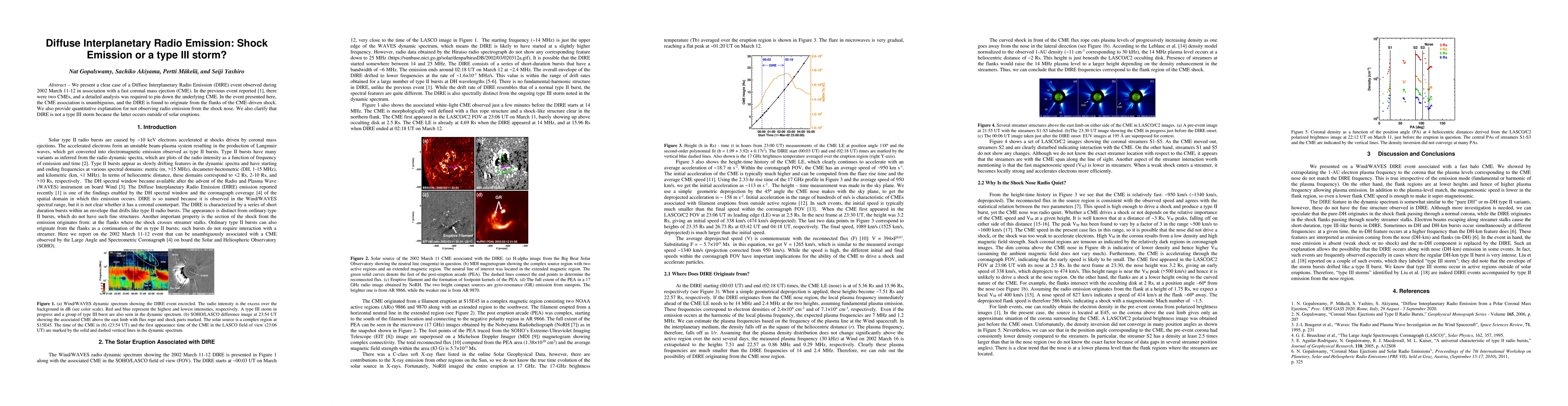 This paper presents a clear case of a Diffuse Interplanetary Radio Emission (DIRE) event linked to a single, unambiguous coronal mass ejection (CME) in March 2002, showing that DIRE originates from the CME-driven shock's flanks, and clarifies that DIRE differs from type III storms, which occur outside solar eruptions.