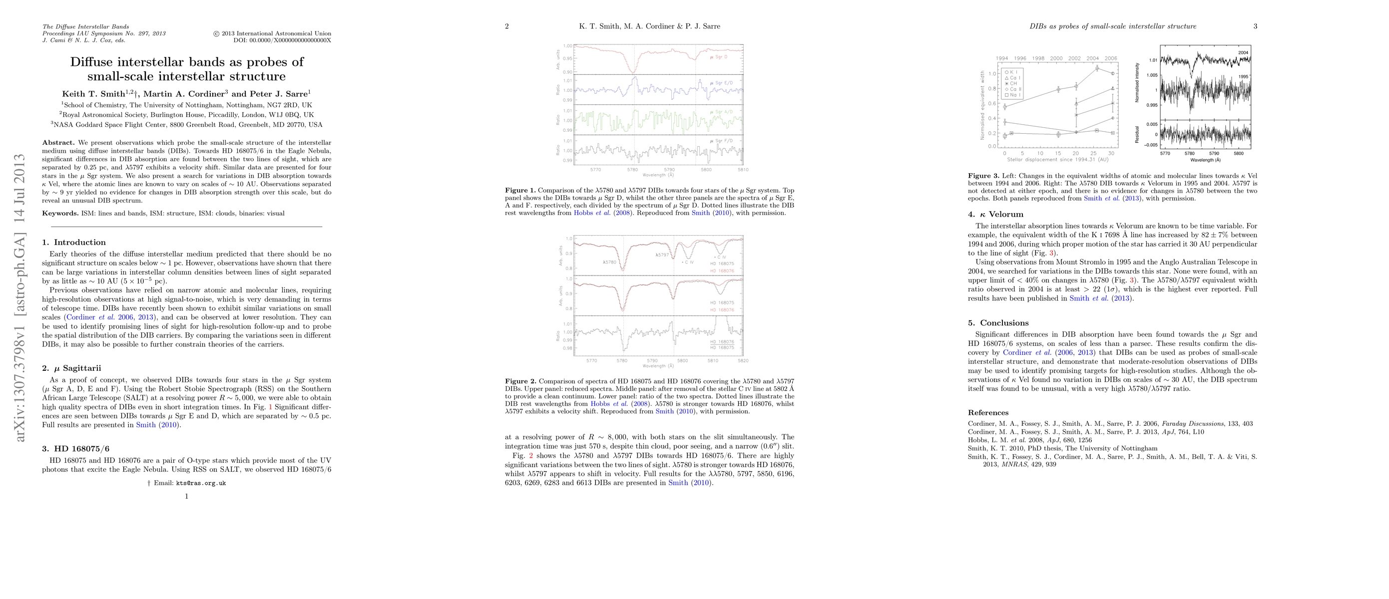 We present observations which probe the small-scale structure of the interstellar medium using diffuse interstellar bands (DIBs). Towards HD 168075/6 in the Eagle Nebula, significant differences in DIB absorption are found between the two lines of sight, which are separated by 0.25 pc, and {\lambda}5797 exhibits a velocity shift. Similar data are presented for four stars in the {\mu} Sgr system. We also present a search for variations in DIB absorption towards {\kappa} Vel, where the atomic lines are known to vary on scales of ~10 AU. Observations separated by ~9 yr yielded no evidence for changes in DIB absorption strength over this scale, but do reveal an unusual DIB spectrum.