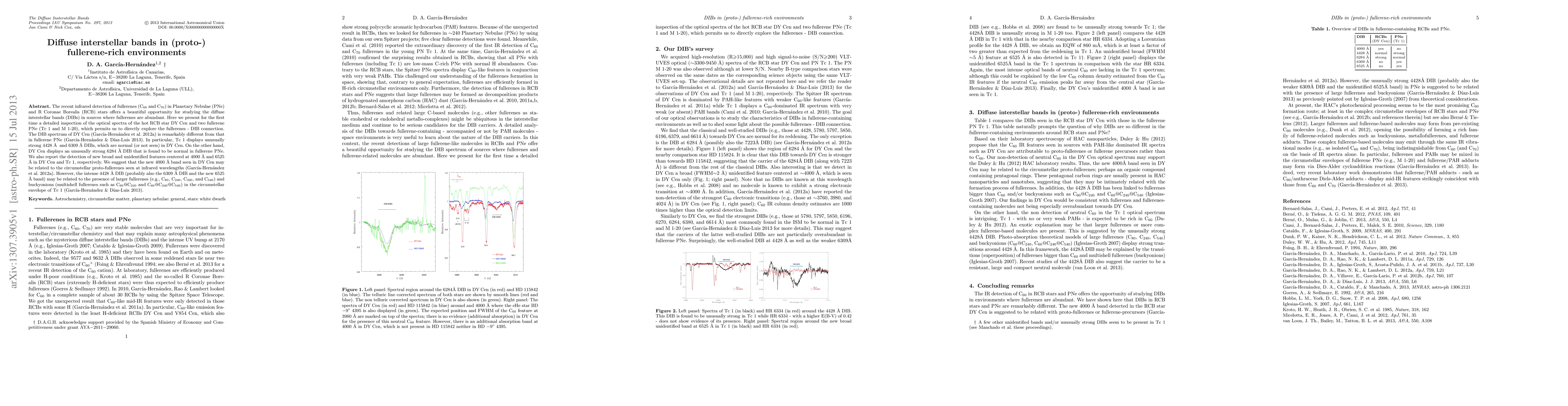 This research investigates the relationship between diffuse interstellar bands (DIBs) and fullerenes in specific stellar environments, finding notable differences in DIB spectra between fullerene-rich Planetary Nebulae (Tc 1 and M 1-20) and the RCB star DY Cen. The study suggests that certain DIBs may correlate with the presence of larger fullerenes and buckyonions in the stellar envelopes.