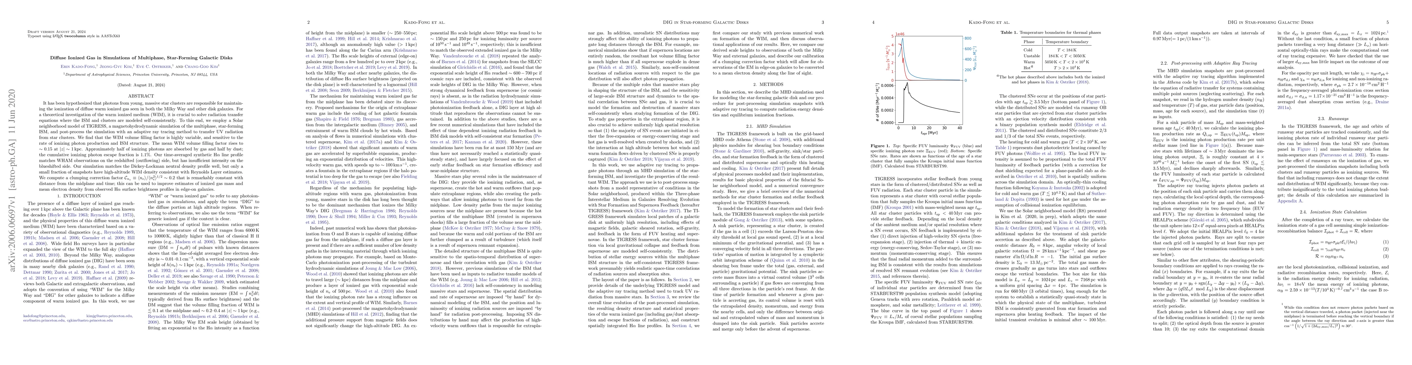 This study investigates the ionization of diffuse warm ionized gas in star-forming galactic disks using a magnetohydrodynamic simulation and adaptive ray tracing. The results show a highly variable warm ionized medium volume filling factor, with a mean value of ~0.15 at |z|~1 kpc, and a constant clumping correction factor C = 0.2 for improving ionized gas mass estimates from H$\alpha$ observations.