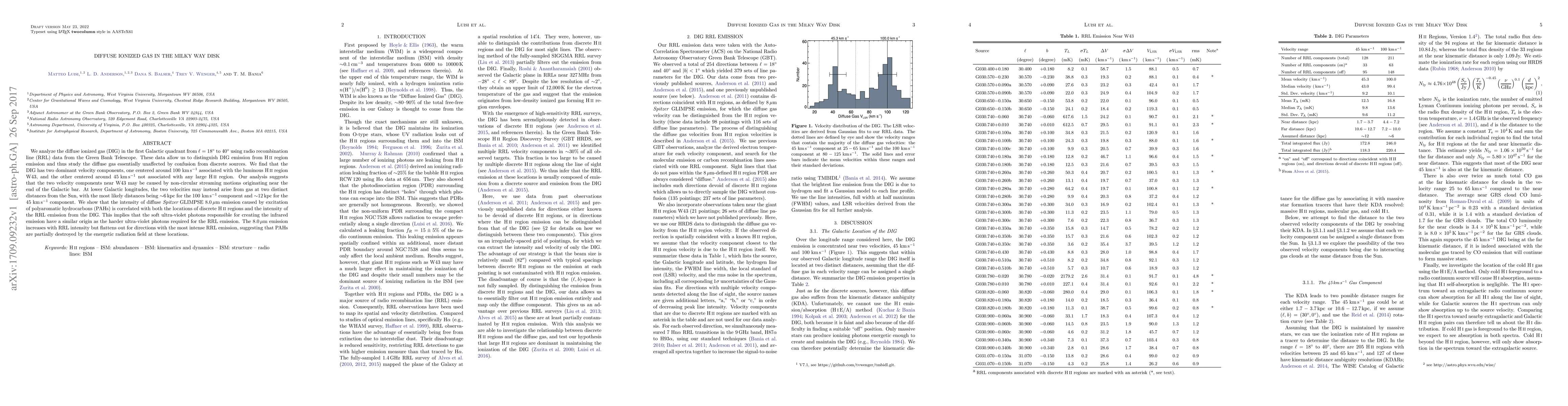 Researchers analyzed diffuse ionized gas in the Milky Way's first quadrant, finding two dominant velocity components associated with a luminous HII region and possibly caused by non-circular streaming motions or gas at distinct distances from the Sun.