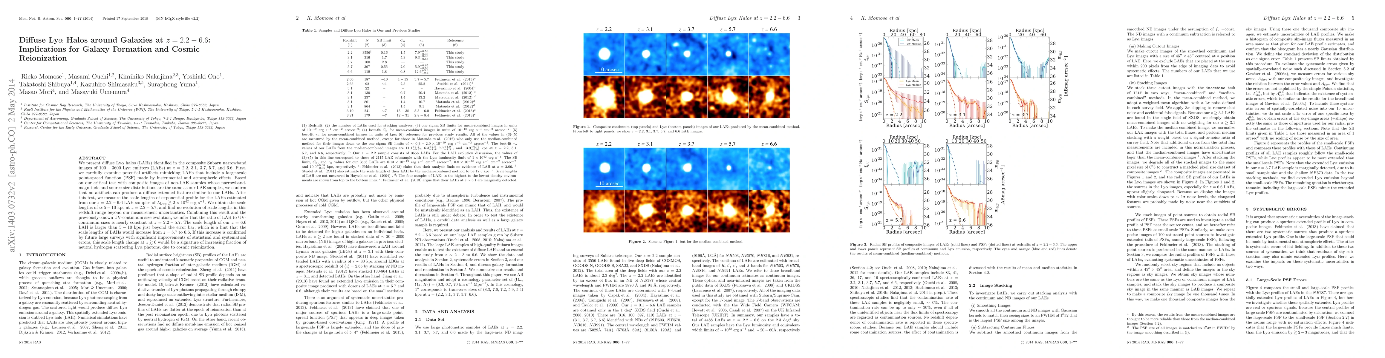 This paper identifies diffuse Lyman-alpha halos around galaxies at high redshifts (z=2.2-6.6) and confirms their presence through careful artifact analysis. The study finds that these halos' scale lengths remain consistent at 5-10 kpc from z=2.2 to 5.7, suggesting a stable ratio of halo size to UV-continuum size, but hints at a potential increase in scale length at z=6.6, possibly indicating the influence of cosmic reionization.