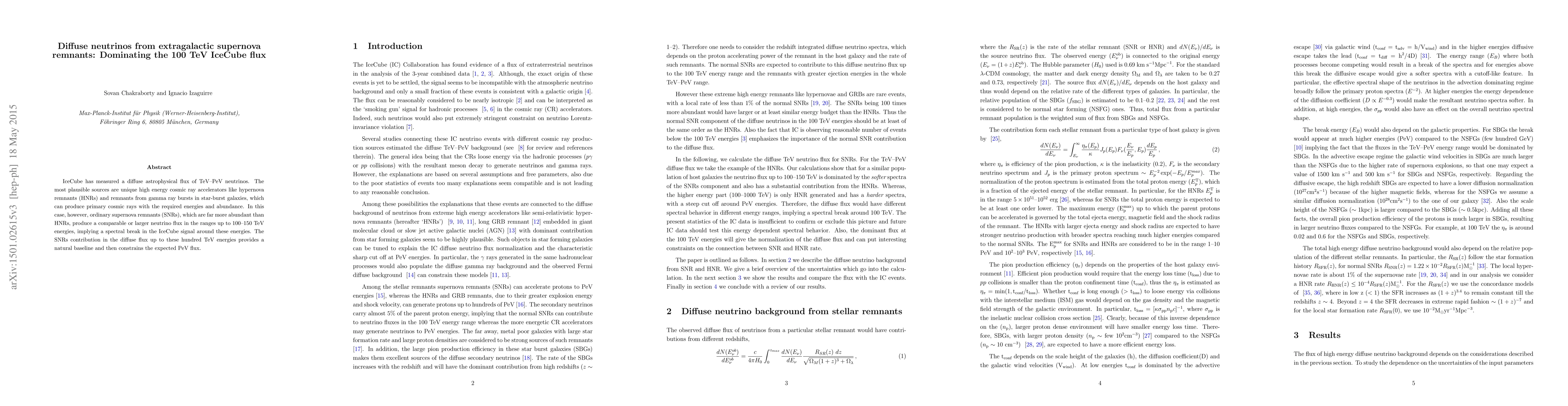 IceCube has measured a diffuse astrophysical flux of TeV-PeV neutrinos. The most plausible sources are unique high energy cosmic ray accelerators like hypernova remnants (HNRs) and remnants from gamma ray bursts in star-burst galaxies, which can produce primary cosmic rays with the required energies and abundance. In this case, however, ordinary supernova remnants (SNRs), which are far more abundant than HNRs, produce a comparable or larger neutrino flux in the ranges up to 100-150 TeV energies, implying a spectral break in the IceCube signal around these energies. The SNRs contribution in the diffuse flux up to these hundred TeV energies provides a natural baseline and then constrains the expected PeV flux.