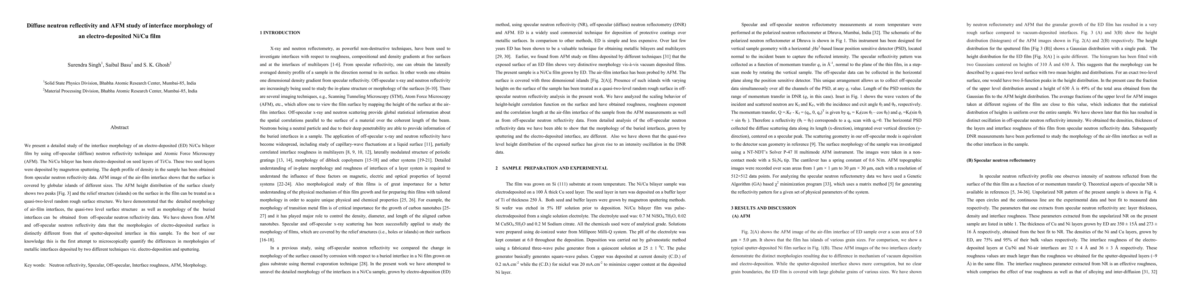 This study uses diffuse neutron reflectivity and AFM to analyze the interface morphology of an electro-deposited Ni/Cu bilayer film on Ti/Cu seed layers. The AFM reveals a quasi-two-level random rough surface structure, while neutron reflectivity data provides insights into the buried interfaces, showing distinct morphologies between electro-deposited and sputter-deposited layers.
