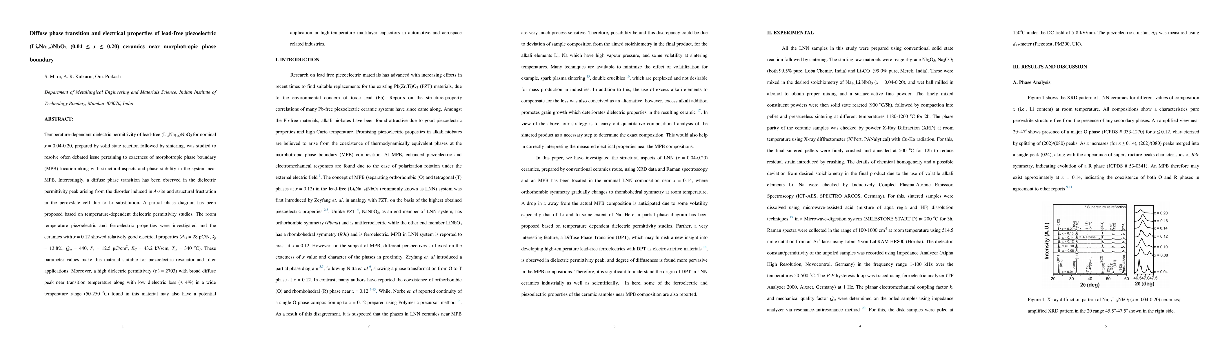 Temperature-dependent dielectric permittivity of lead-free (LixNa1-x)NbO3 for nominal x = 0.04-0.20, prepared by solid state reaction followed by sintering, was studied to resolve often debated issue pertaining to exactness of morphotropic phase boundary (MPB) location along with structural aspects and phase stability in the system near MPB. Interestingly, a diffuse phase transition has been observed in the dielectric permittivity peak arising from the disorder induced in A-site and structural frustration in the perovskite cell due to Li substitution. A partial phase diagram has been proposed based on temperature-dependent dielectric permittivity studies. The room temperature piezoelectric and ferroelectric properties were investigated and the ceramics with x = 0.12 showed relatively good electrical properties (d33 = 28 pC/N, kp = 13.8%, Qm = 440, Pr = 12.5 {micro}C/cm2, EC = 43.2 kV/cm, Tm = 340 oC). These parameter values make this material suitable for piezoelectric resonator and filter applications. Moreover, a high dielectric permittivity (= 2703) with broad diffuse peak near transition temperature along with low dielectric loss (< 4%) in a wide temperature range (50-250 oC) found in this material may also have a potential application in high-temperature multilayer capacitors in automotive and aerospace related industries.