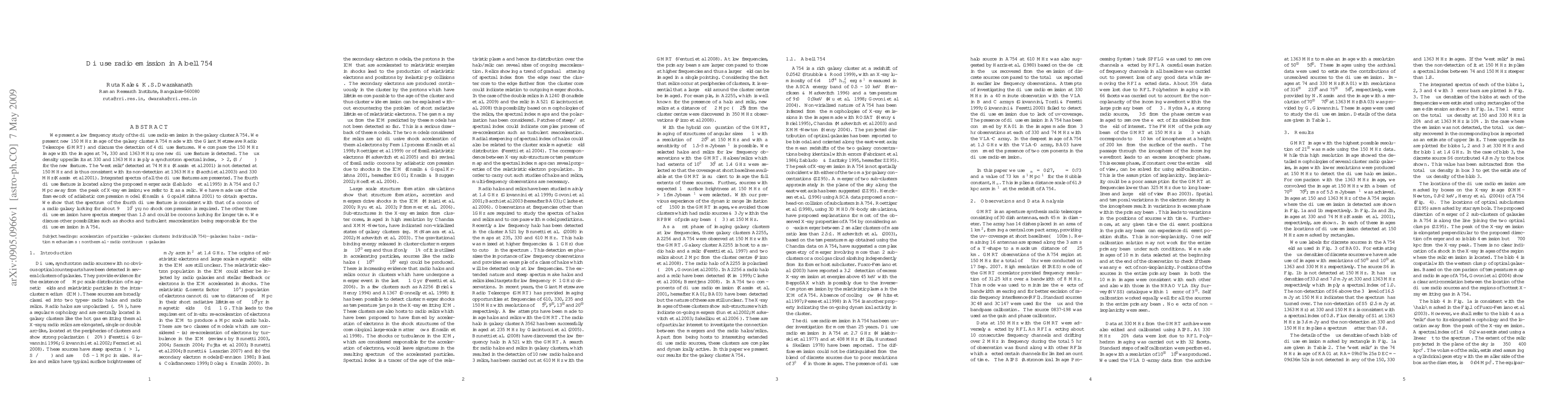 The research studies diffuse radio emission in Abell 754, detecting four features using GMRT at 150 MHz. It finds that one feature's spectrum aligns with a radio galaxy cocoon model, while others may result from shocks or turbulent reacceleration. The west relic is not detected at 150 MHz, supporting previous non-detections at higher frequencies.