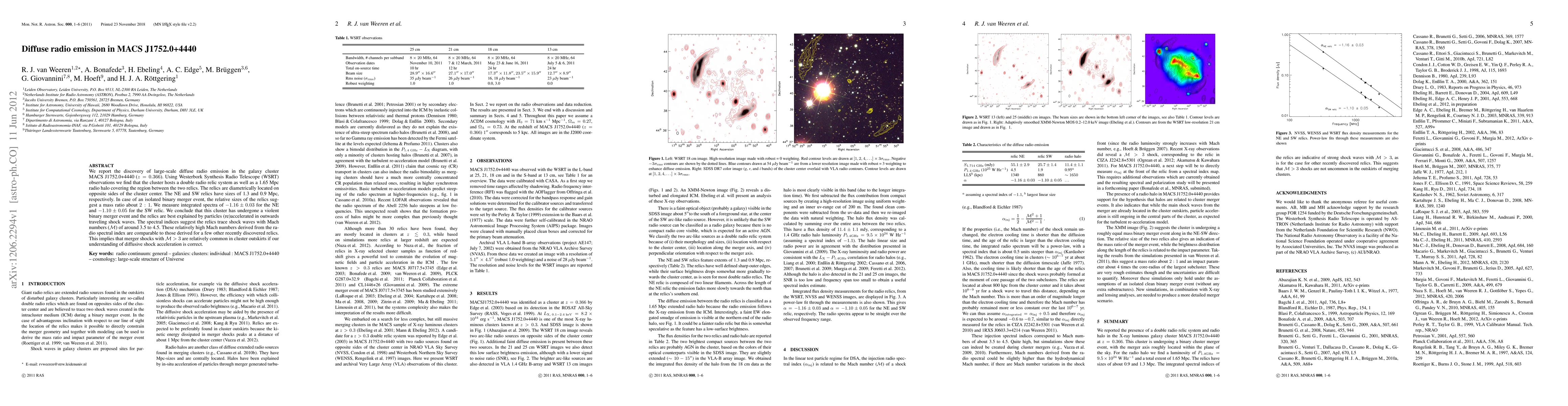 Researchers discovered large-scale diffuse radio emission in galaxy cluster MACS J1752.0+4440, indicating a violent binary merger event that accelerated particles in shock waves.