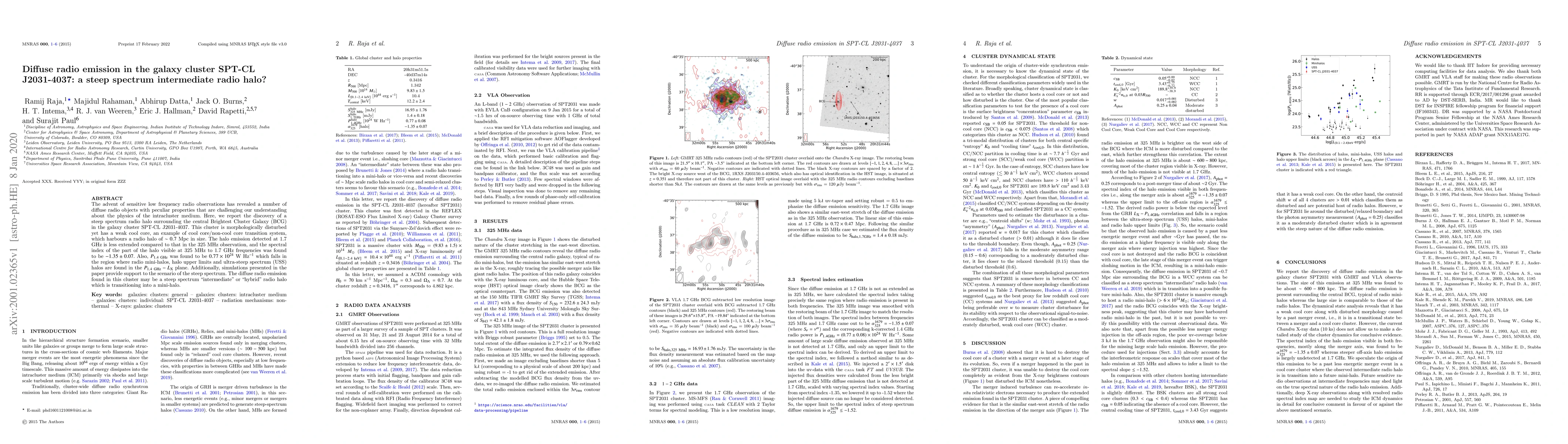 The research utilized GMRT and VLA radio observations at 325 MHz and 1.7 GHz, respectively, to study the diffuse radio emission in the galaxy cluster SPT-CL J2031-4037.