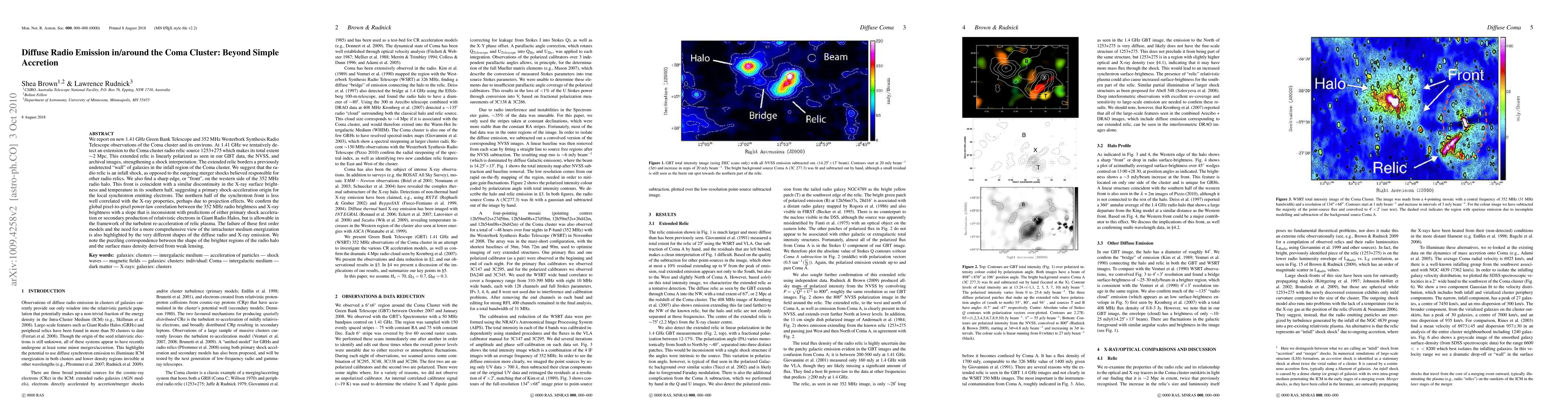 We report on new 1.41 GHz Green Bank Telescope and 352 MHz Westerbork Synthesis Radio Telescope observations of the Coma cluster and its environs. At 1.41 GHz we tentatively detect an extension to the Coma cluster radio relic source 1253+275 which makes its total extent ~2 Mpc. This extended relic is linearly polarized as seen in our GBT data, the NVSS, and archival images, strengthening a shock interpretation. The extended relic borders a previously undetected "wall" of galaxies in the infall region of the Coma cluster. We suggest that the radio relic is an infall shock, as opposed to the outgoing merger shocks believed responsible for other radio relics. We also find a sharp edge, or "front", on the western side of the 352 MHz radio halo. This front is coincident with a similar discontinuity in the X-ray surface brightness and temperature in its southern half, suggesting a primary shock-acceleration origin for the local synchrotron emitting electrons. The northern half of the synchrotron front is less well correlated with the X-ray properties, perhaps due to projection effects. We confirm the global pixel-to-pixel power-law correlation between the 352 MHz radio brightness and X-ray brightness with a slope that is inconsistent with predictions of either primary shock acceleration or secondary production of relativistic electrons in Giant Radio Halos, but is allowable in the framework of the turbulent re-acceleration of relic plasma. The failure of these first order models and the need for a more comprehensive view of the intracluster medium energization is also highlighted by the very different shapes of the diffuse radio and X-ray emission. We note the puzzling correspondence between the shape of the brighter regions of the radio halo and the surface mass density derived from weak lensing.